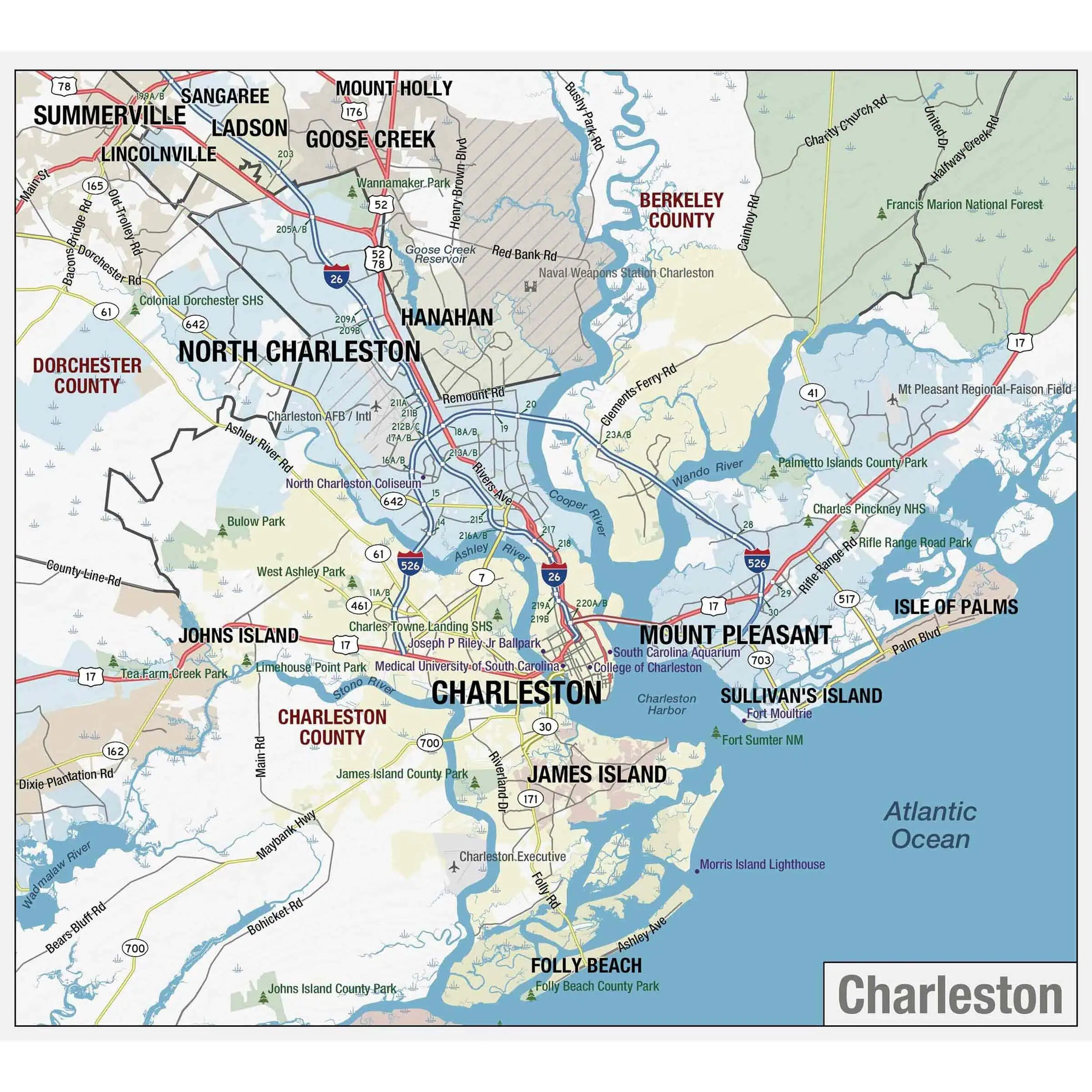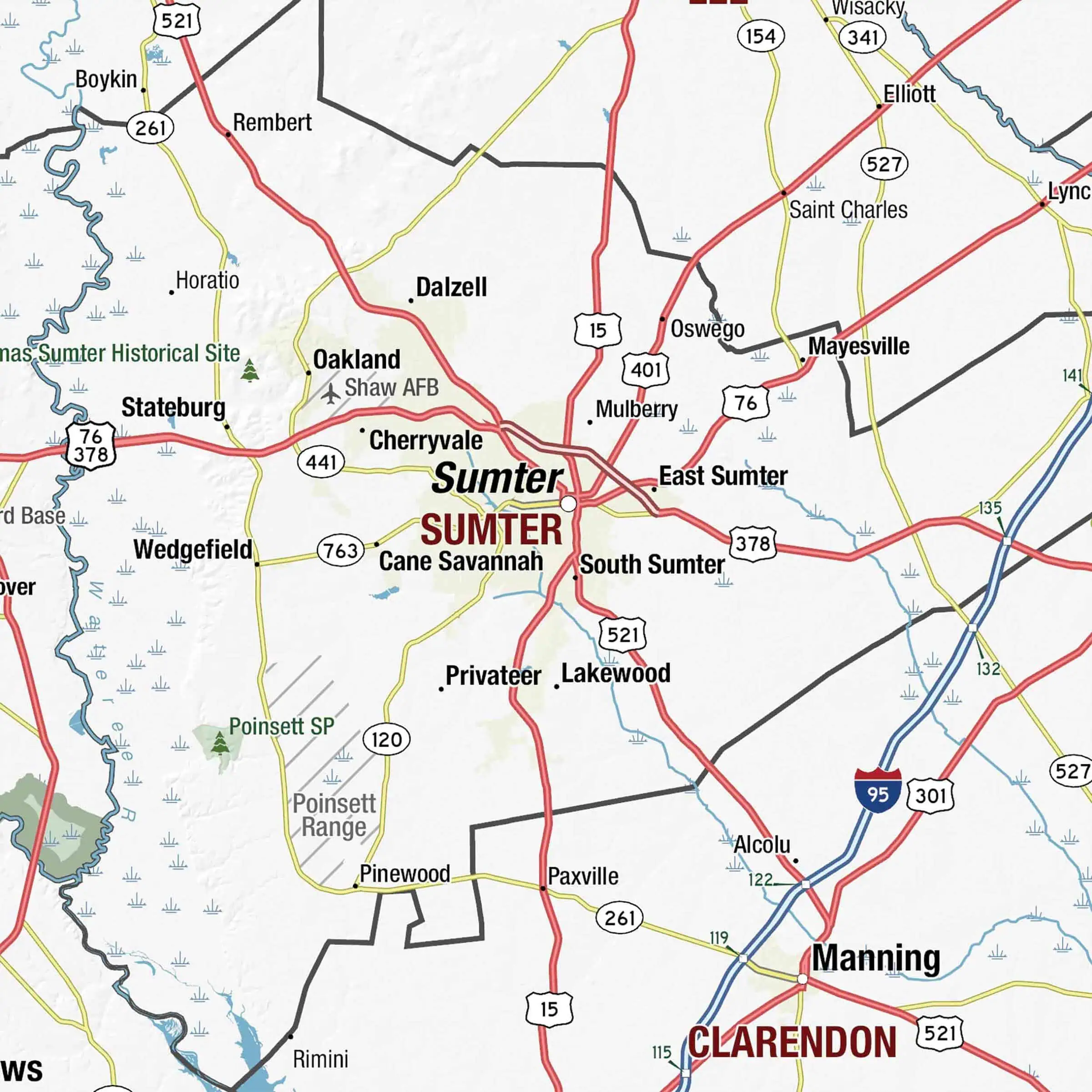 We even include four (4) insets of the major metropolitan cities to include even more detail. Insets include added detail such as Local Roads, Sports Stadiums, College & Universities, Zoos & Aquariums, Outdoor Concert Venues, and more! The color palette, font families, and graphic elements elevate the look of this map beyond all others. The South Carolina State Wall Map features a neutral marine color (oceans, lakes, and rivers) and a subtle color scheme for the countries. Because of the colors chosen, this map’s look is universal and can be used in office, home, and school environments.