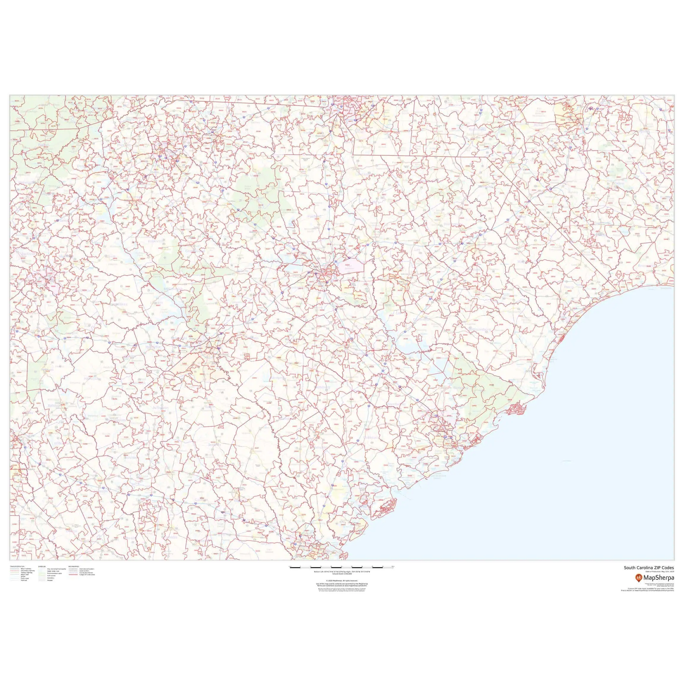 This map of South Carolina shows zip codes overlaid on a road map. Base map features include municipality and county boundaries, major road network features, and state and national parks and conservation areas.