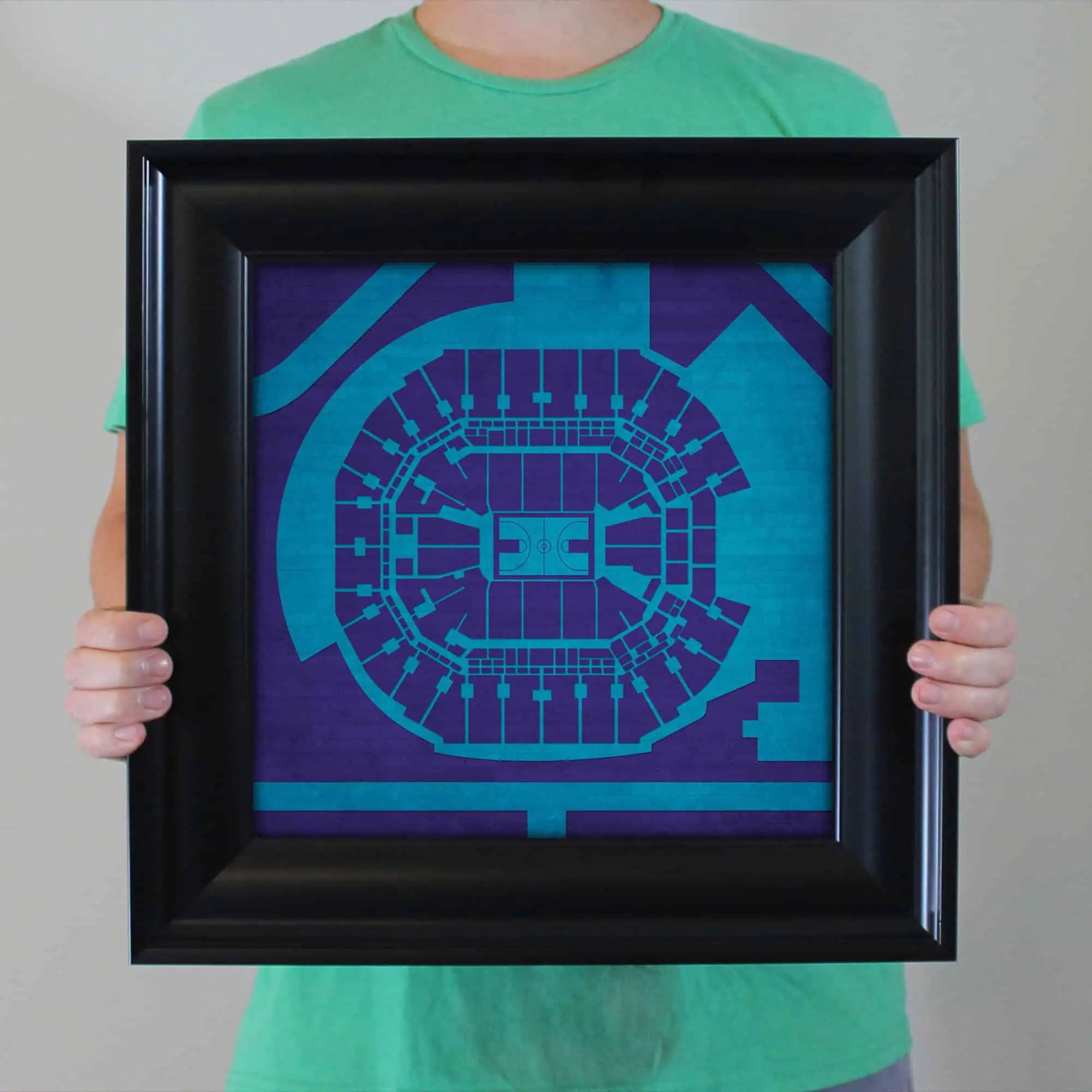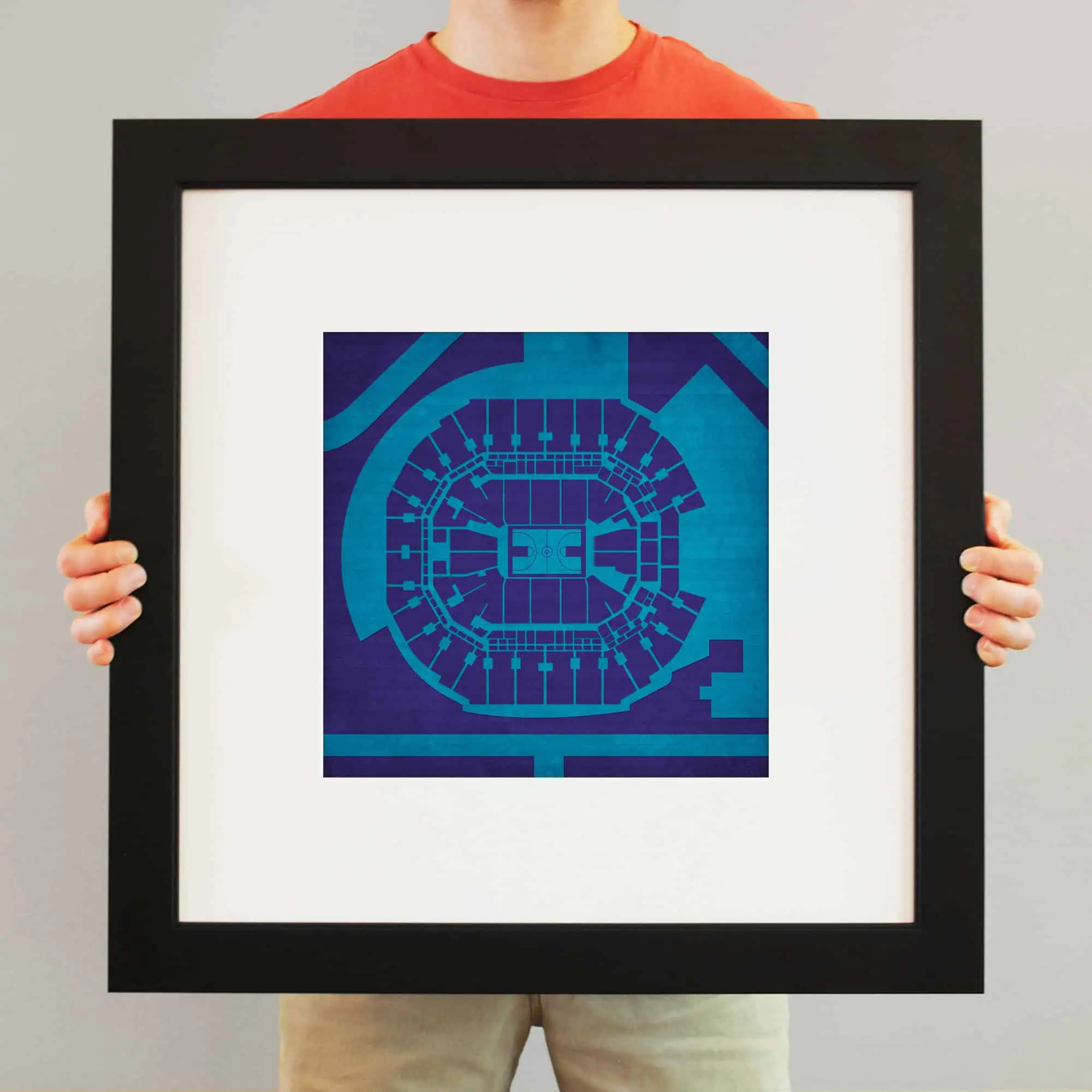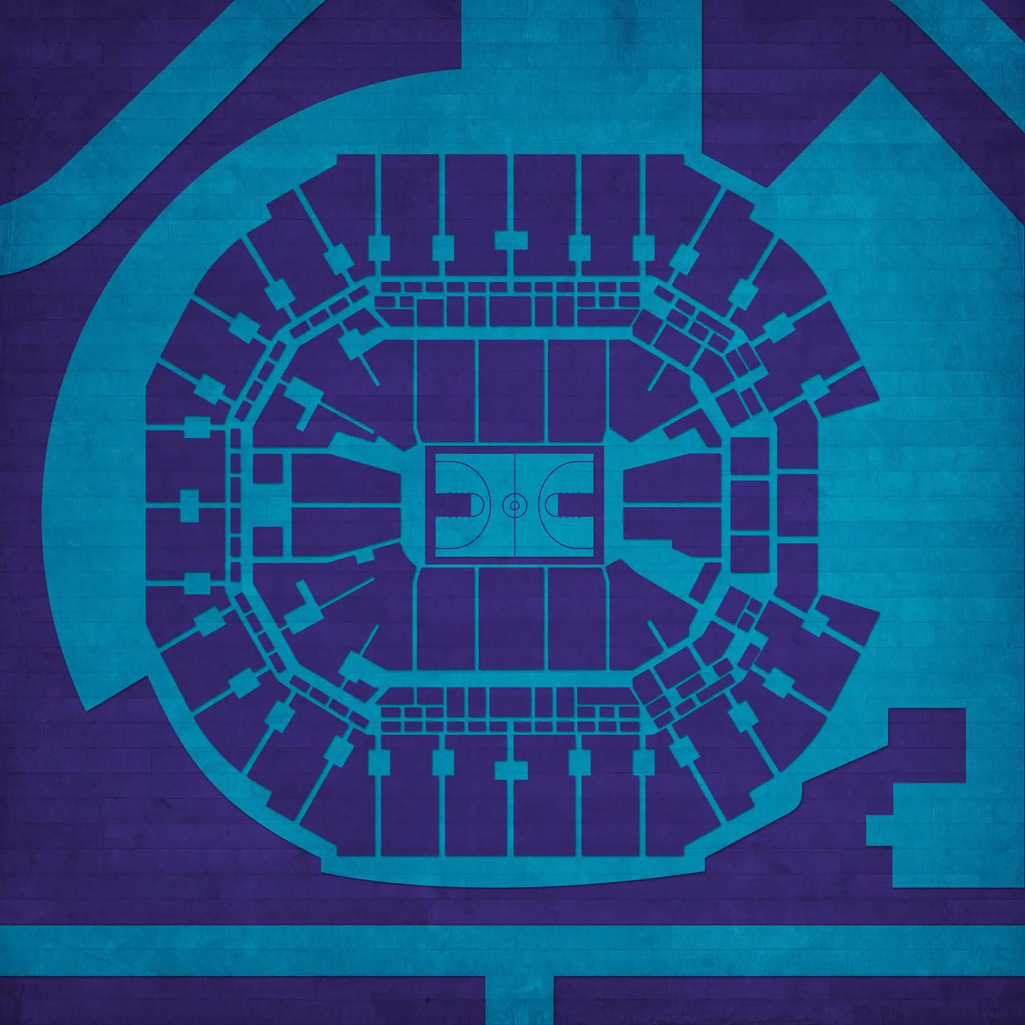 Map art print including the aerial view of Spectrum Center located in Charlotte, North Carolina.