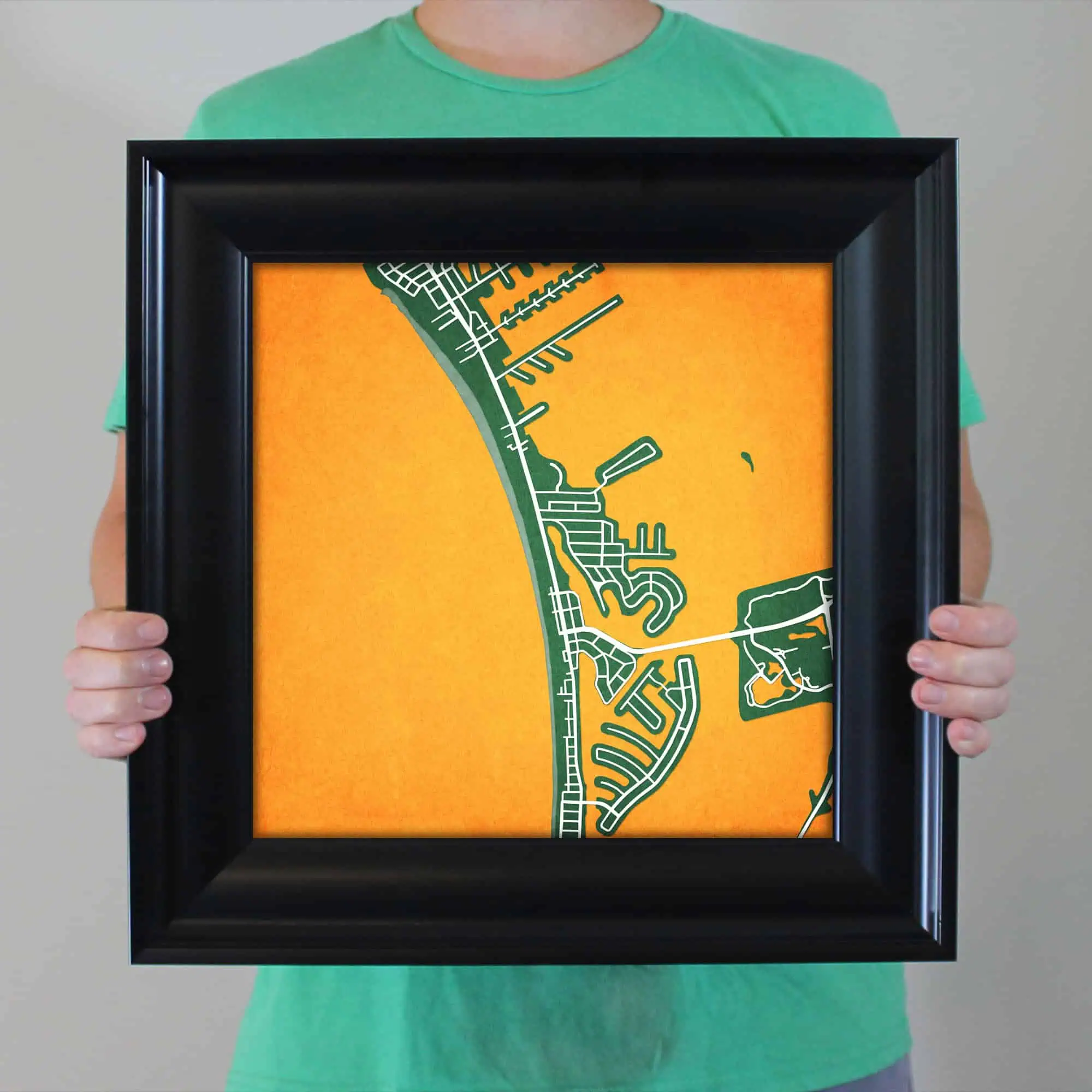 The size of this frame will vary depending on the size of the map you created. Frames are 16.5″ x 16.5″ for 12″ x 12″ prints and frames are 16.5″ x 20.5″ for 12″ x 16″ maps. Our frames have a black 2.75” wide heavy polystyrene molding. We choose to mount the prints without a glass/acrylic overlay, which shows off the unique properties of our paper stock when it hits the light. The back of the frame is sealed with a dust cover for added protection. Industrial silver hanging hardware is fixed to the back of the frame so it’s ready to hang on your wall.