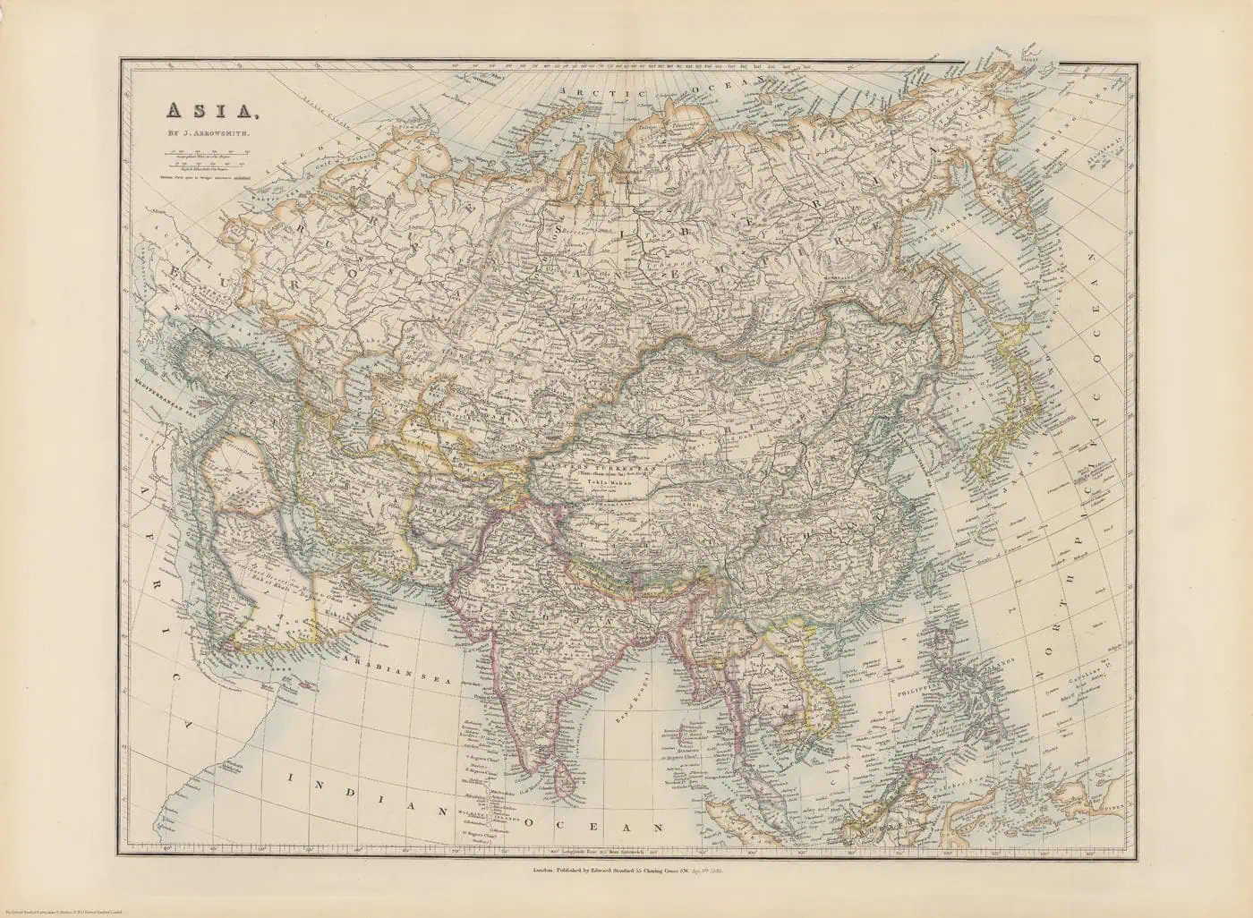 The Stanford's Asia Map is from a fascinating series of reproductions from our Edward Stanford Cartographic Collection archive. This map was made by the famous cartographer John Arrowsmith and published by Stanfords in 1884. Country boundaries are outlined in bright colours while the pale background with subtle hachure to show the mountain ranges makes the numerous place names easy to read. Many smaller tributaries of the continent's great rivers are named, from the Ob, the Yenisei and the Lena in the north to the Ganges or the Irrawaddy in the south and the Yangtze in the east. Coverage extends to the Equator, so the southern part of Indonesia is not included. While the north of the continent looks as it was 100 years later except for the changes in the European part of Russia, Central Asia and the Middle East are much different from now, Mongolia is still part of China, etc. Names of Chinese ports open to foreign commerce after the Second Opium War are underlined; "Hong-kong I. & Victoria" are duly annotated with Cy for colony. Latitude and longitude lines are drawn at 5° intervals.