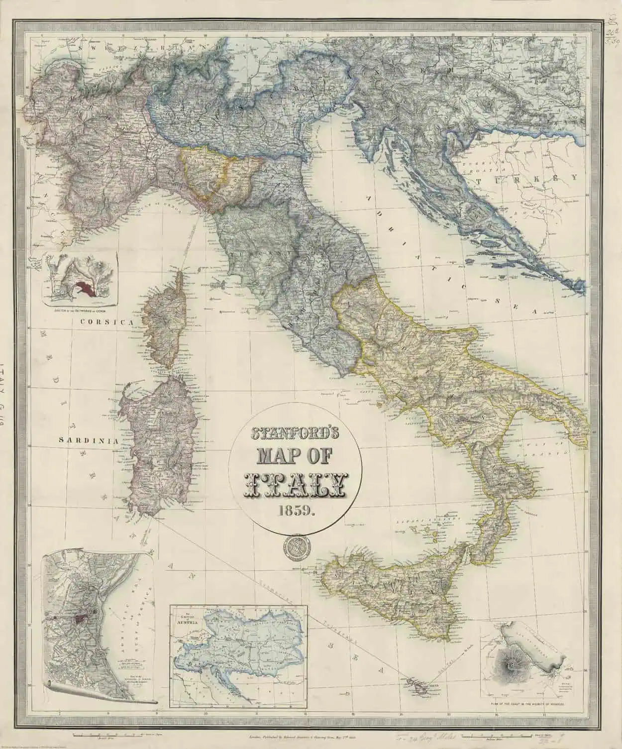 The Stanford's Map of Italy is from a fascinating series of reproductions from our Edward Stanford Cartographic Collection archive. This is a reproduction of a map originally published on 2nd May 1859 by Edward Stanford, the founder of our company. The map catches the country in an interesting stage of its history, just before the unification, and still shows the individual states: the Kingdom of Piedmont – Sardinia, the Grand Duchy of Tuscany, the Kingdom of the Two Sicilies, the Papal States, etc, all in different colours. Hachures are used to show the spine of the Apennines and other mountainous regions. Interesting insets show enlargements of the environs of Venice, Genoa and Naples with Vesuvius, and another panel presents the whole of the Austro-Hungarian Empire which then still included Lombardy and north-eastern Italy. This reproduction was taken from what used to be called a "cloth-dissected" map, made when the map itself was cut into sections and each section then individually pasted onto an overall cloth backing for the whole map. In this version the whole map is backed onto cloth in one piece but the gaps between the sections have been reproduced in the printing to preserve the style and the feeling of the original. This lovely map will appeal to anyone interested in this great country.