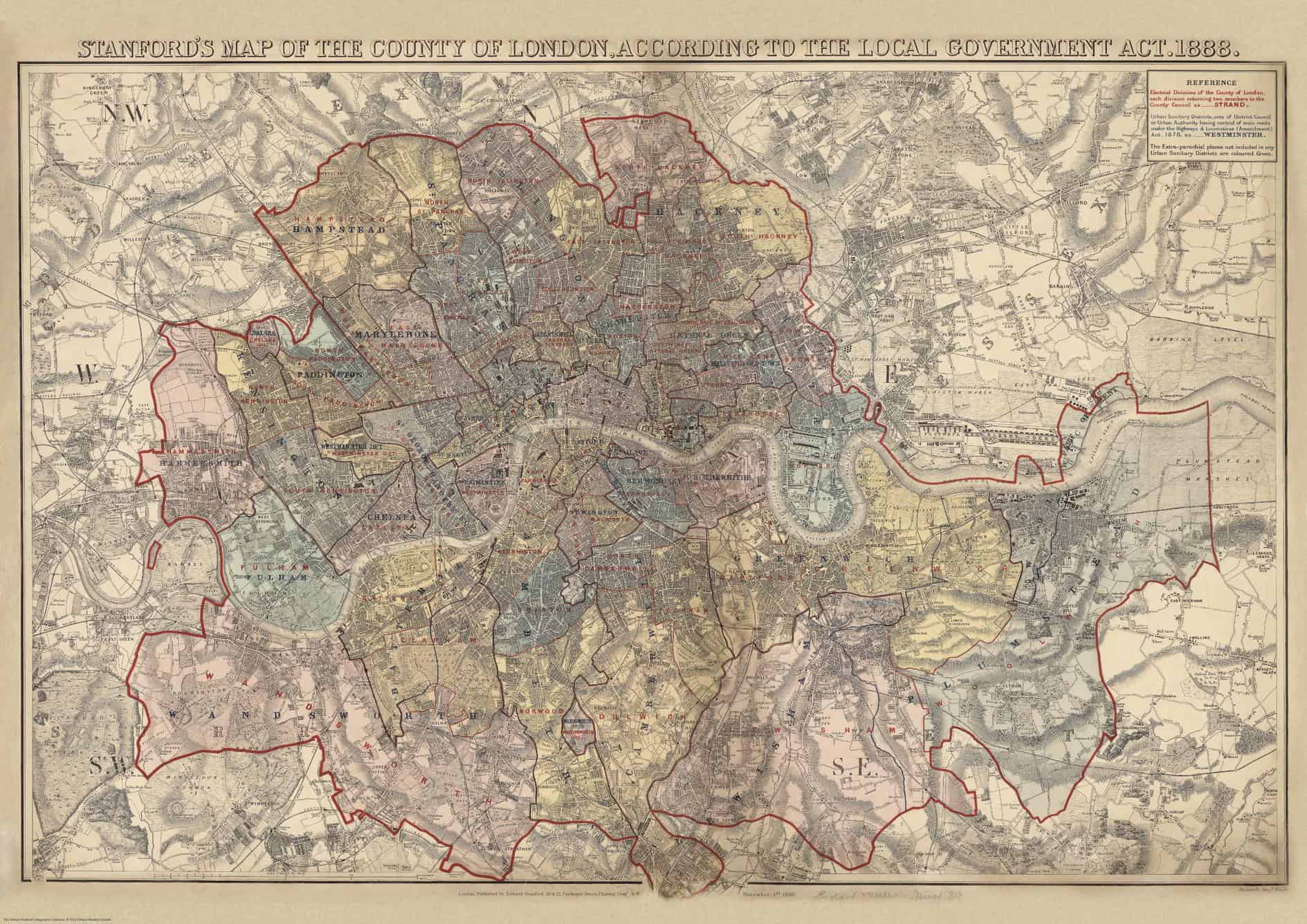 This map is from a fascinating series of reproductions from our Edward Stanford Cartographic Collection archive. The Stanford's Map of the County of London, According to the Local Government Act 1888, to give it its full title, presenting the administrative division of the capital and indicating the boundaries of both the Electoral Divisions returning two members to the County Council and of the Urban Sanitary Districts with control of main roads under the Highways and Locomotives (Amendment) Act of 1878. The colouring and the boundaries are overlaid on a street plan with names of main and selected smaller streets, graphics indicating parks and other common land, railway lines, etc. Hachures show the topography with the hills of north and south London clearly marked. This is London which, administratively, extends north of the Thames between Hammersmith, Hampstead, Stamford Hill and Poplar, and south of the river between Putney, Streatham, Lower Sydenham and Eltham (although the map itself extends a bit further out, particularly in the north-east). An interesting feature is the inclusion within the County of London of a small area outside its overall boundary – the site of the present day Leg of Mutton Nature Reserve in Barnes.