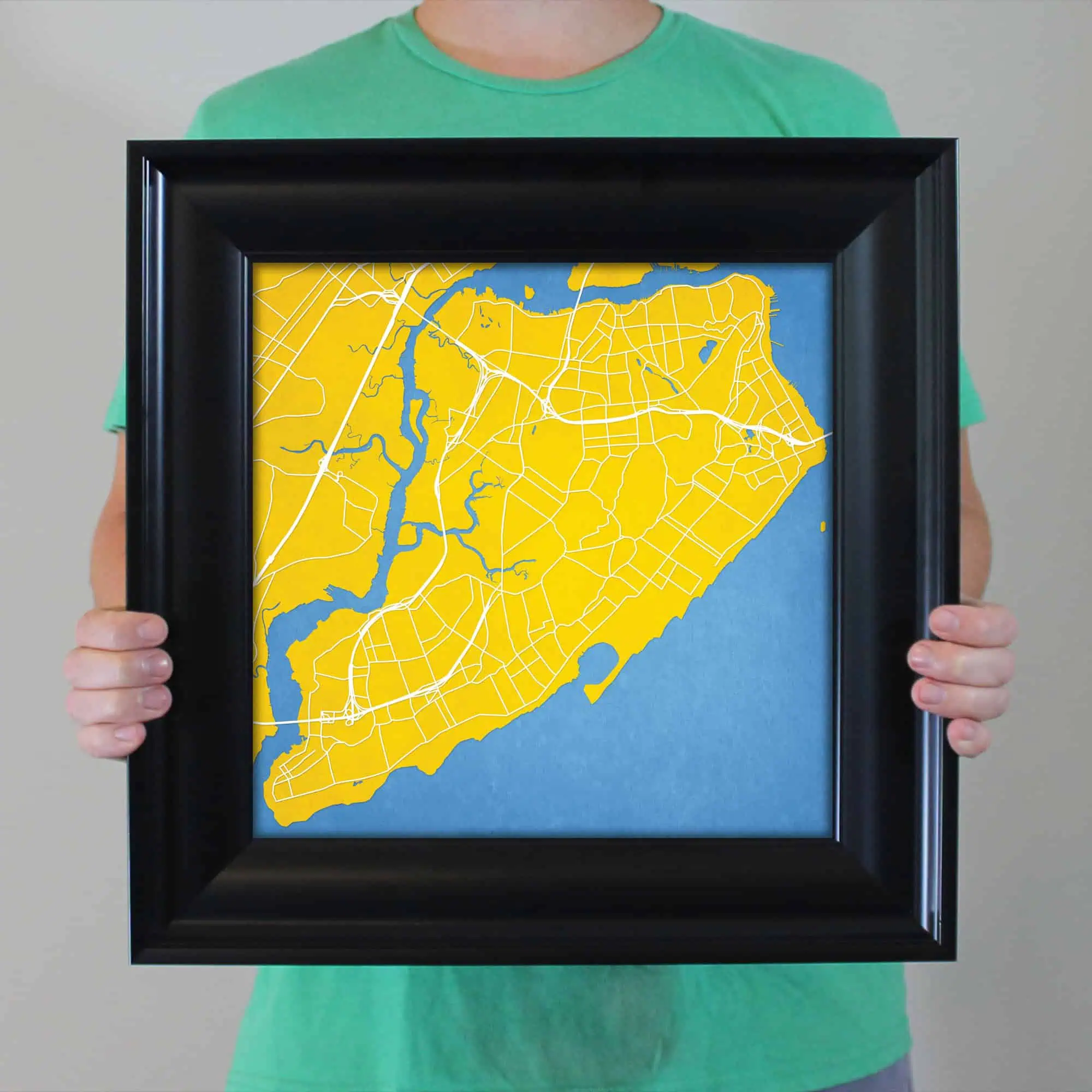 The size of this frame will vary depending on the size of the map you created. Frames are 16.5″ x 16.5″ for 12″ x 12″ prints and frames are 16.5″ x 20.5″ for 12″ x 16″ maps. Our frames have a black 2.75” wide heavy polystyrene molding. We choose to mount the prints without a glass/acrylic overlay, which shows off the unique properties of our paper stock when it hits the light. The back of the frame is sealed with a dust cover for added protection. Industrial silver hanging hardware is fixed to the back of the frame so it’s ready to hang on your wall.