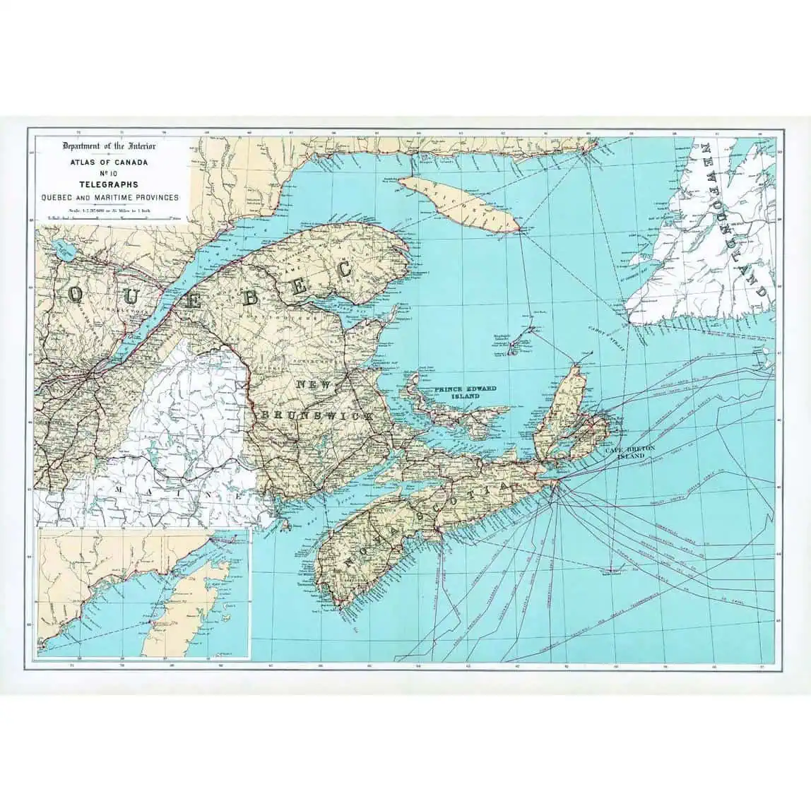 Contained within the 1st Edition (1906) of the Atlas of Canada is a map that shows the network and destinations of telegraph lines in Quebec and Maritime Provinces. More then one line may have followed the same route, but only one line is indicated on the map, especially in larger cities. Therefore, well-settled portions of the country are likely to have more then one telegraph line serving the principal towns along each route indicated. Most telegraph lines are alongside railways. The map includes the routes and destinations of underwater cables. It also indicates the shore portions of the various cable lines, including the Marconi stations on the Atlantic coast of Canada, magnified and placed in the bottom left corner. The map also includes major cities, counties, rivers, major bodies of water and the railway system. 24 x 17.25 in