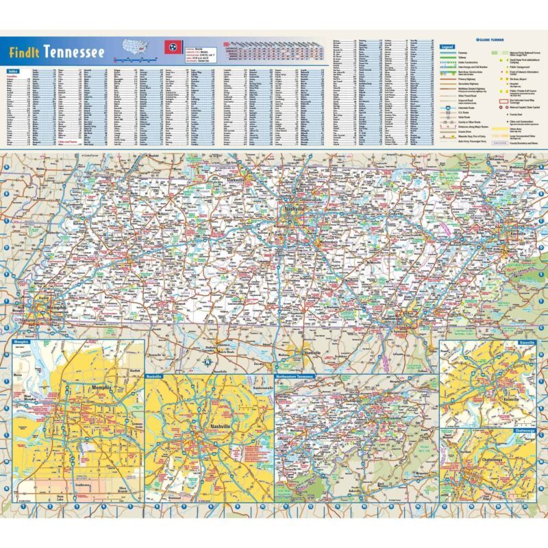 This colorful, easy-to-read state map of Tennessee identifies all major thoroughfares, secondary roads, freeway interchanges, rest areas, distance markers, landmarks, recreational areas, and more. Shaded relief on the state map provides a three-dimensional sense of Oregon’s topography. Detailed city inset maps of Eugene, Portland, and Salem are based on the latest street information from our cartographic experts. An up-to-date inset of Crater Lake National Park provides must-see information on this tourist area. County and city indices make it simple to locate even the smallest town.Â