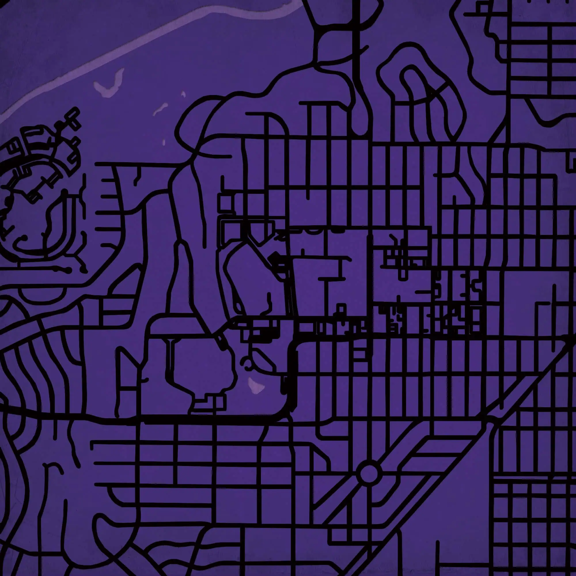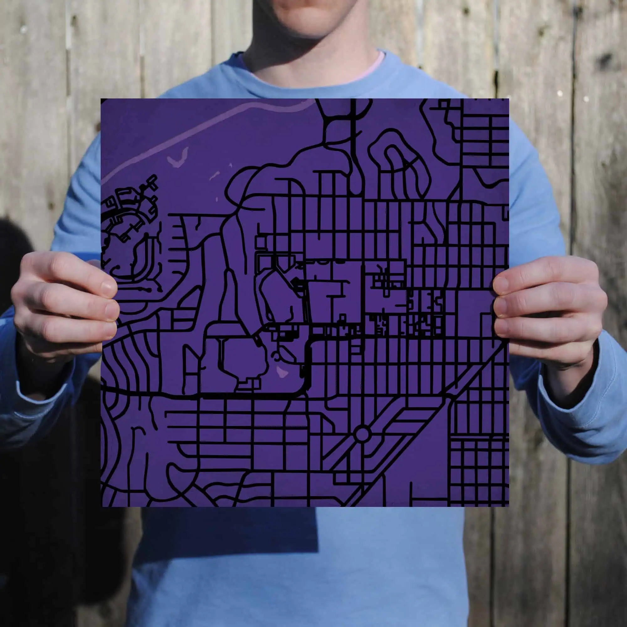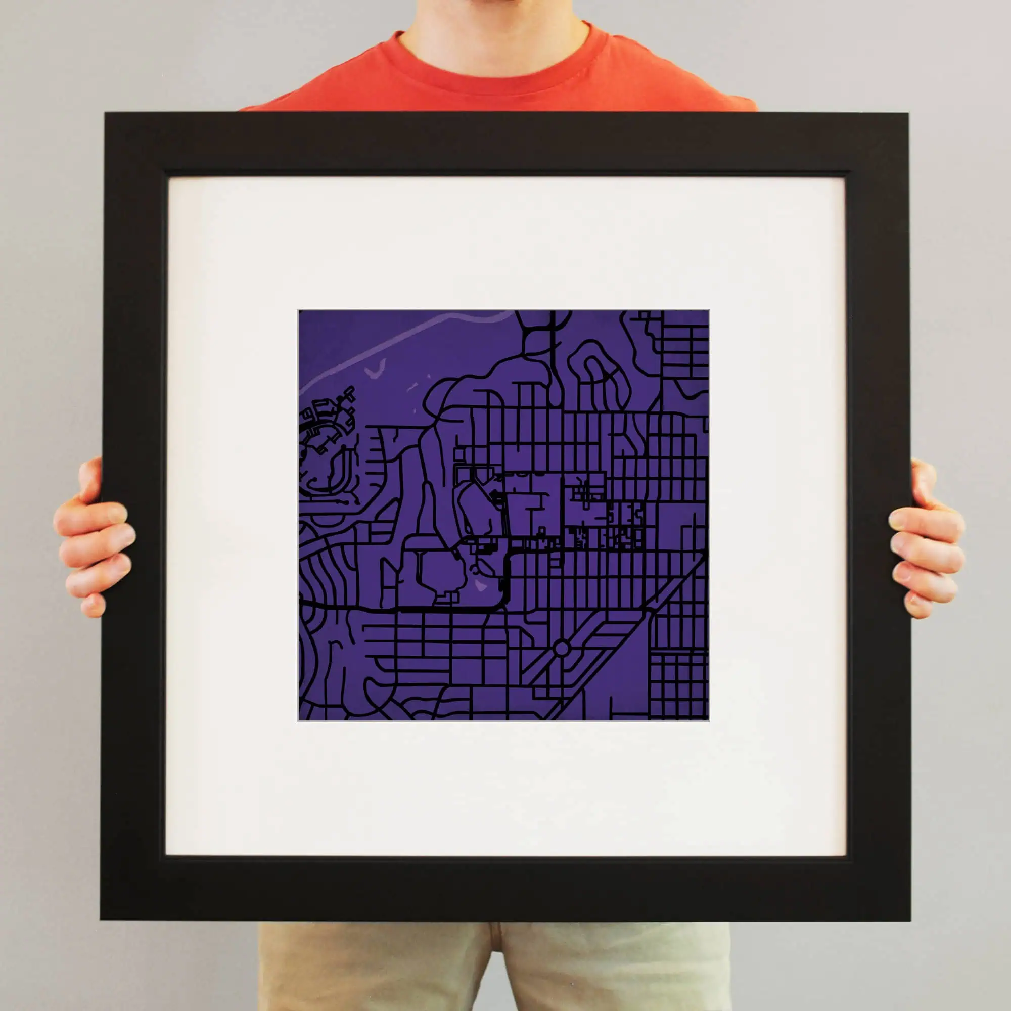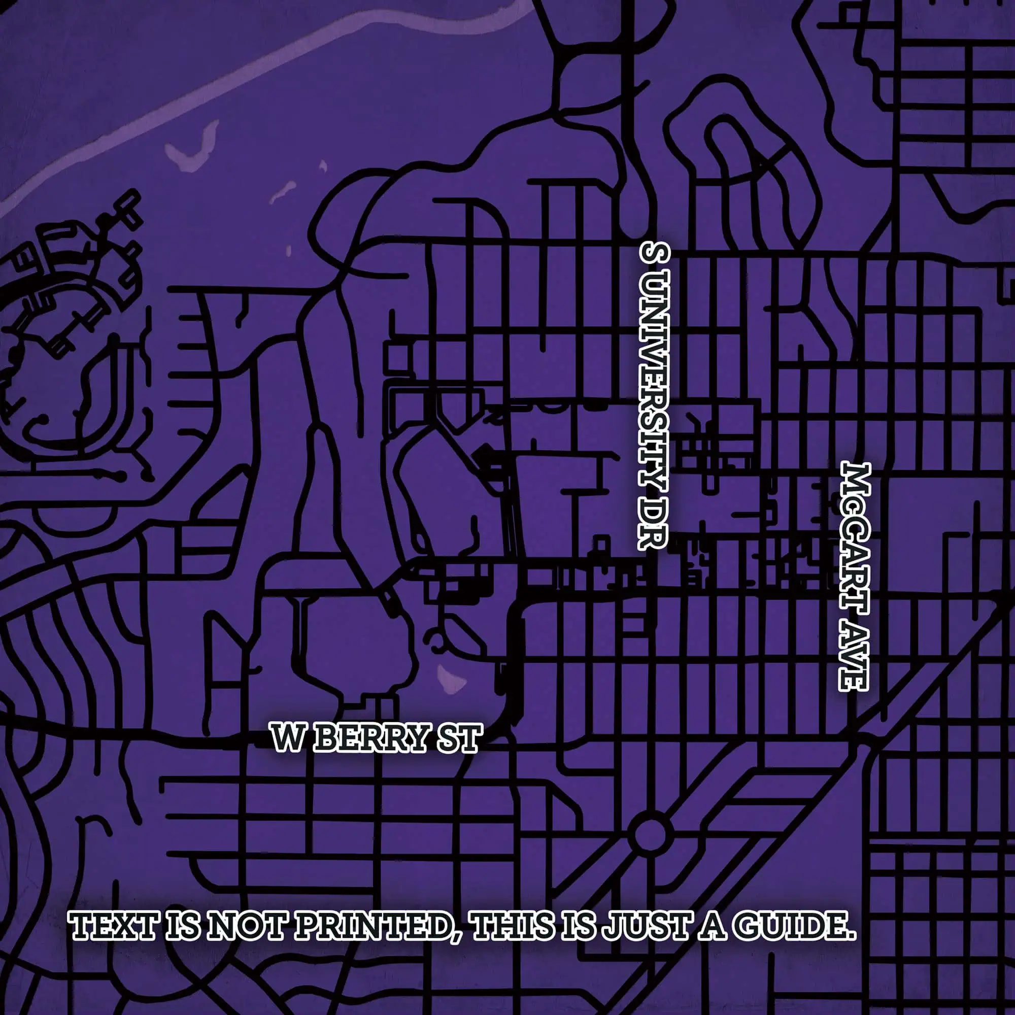 Map art print including Texas Christian University campus located in Fort Worth, Texas.