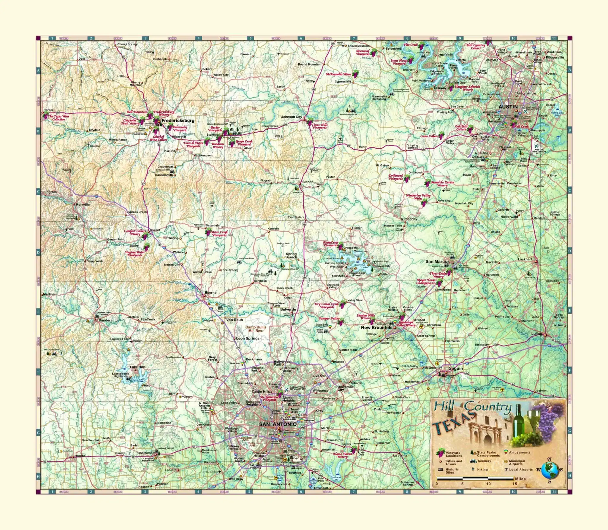 Introducing Compart Maps Texas Hill Country & Wine Wall Map/Mural. Beautifully illustrated with subtle earth tone hues, the detail is highly legible with borders clearly defined. In classic Atlas style, this map can be used for general reference, to track current events, or as a piece of art. Vineyards are clearly shown. Decorators will find the color scheme works beautifully with dark wood furniture and trim.
