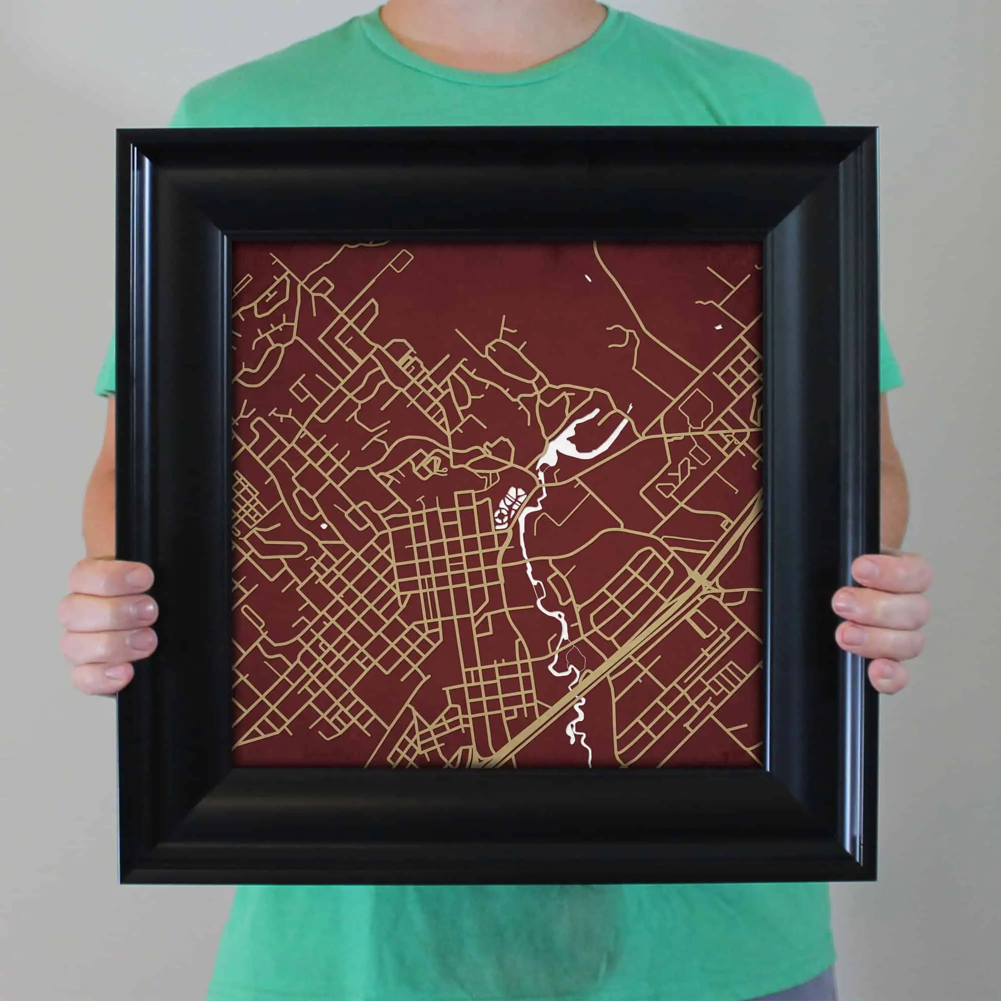 The size of this frame will vary depending on the size of the map you created. Frames are 23″ x 23″ for 12″ x 12″ prints and frames are 15.75″ x 19.75″ for 12″ x 16″ maps. Both frames have a black 1.75” wide genuine-wood molding. The print is enhanced with a soft white acid-free mat, which is bevel cut and placed on top of the print. The print and matt are protected by a premium crystal-clear acrylic overlay. The back of the frame is sealed with a dust cover for added protection. Industrial silver hanging hardware is bolted to the back of the frame so it’s ready to hang on your wall.