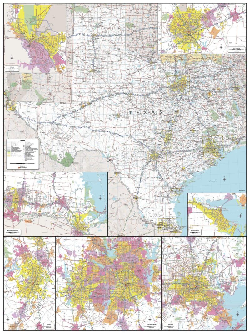 This detailed wall map of Texas is perfect for both educational and business purposes. The easy-to-read map features vibrant colors and clear labeling of cities, counties, highways, and geographical features. All national and state highways that connect the state are all clearly labelled on the map, while the legend notes the different road and land use classifications such as urban, park, military, and many more. The boundaries of each county in the state are defined and named clearly. Whether you are a student, teacher, business person or geography enthusiast, this map is a valuable addition to any space.