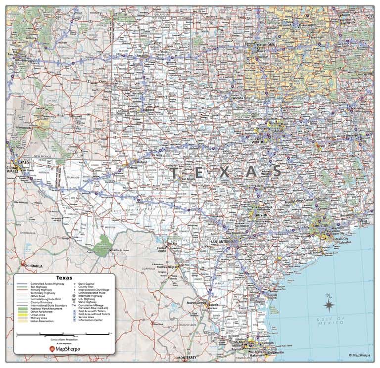 This detailed wall map of Texas is perfect for both educational and business purposes. The easy-to-read map features vibrant colors and clear labeling of cities, counties, highways, and geographical features. All national and state highways that connect the state are all clearly labelled on the map, while the legend notes the different road and land use classifications such as urban, park, military, and many more. The boundaries of each county in the state are defined and named clearly. Whether you are a student, teacher, business person or geography enthusiast, this map is a valuable addition to any space.