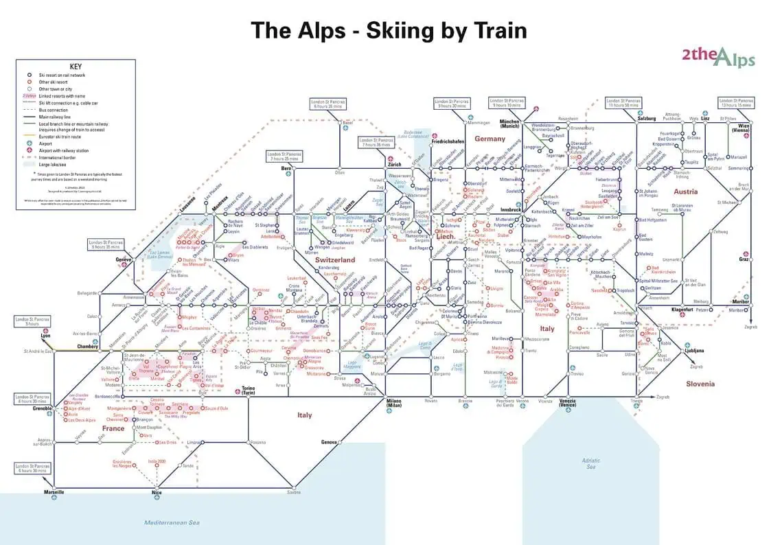 Much like the iconic topological London Underground Map, this schematic style map sets out to simplify rail journeys to and through the Alps. Featuring 200 ski resorts across seven Alpine countries, it shows access cable cars, mountain railways, main lines and the Eurostar route, making it easy for adventurous travellers to plan their own independent journey to the mountains.