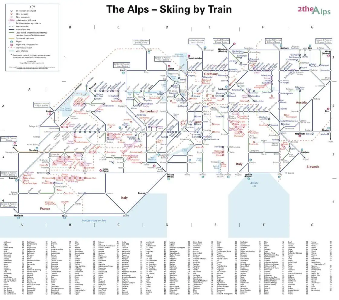 Much like the iconic topological London Underground Map, this fully indexed schematic style map sets out to simplify rail journeys to and through the Alps. Featuring 200 ski resorts across seven Alpine countries, it shows access cable cars, mountain railways, main lines and the Eurostar route, making it easy for adventurous travellers to plan their own independent journey to the mountains.