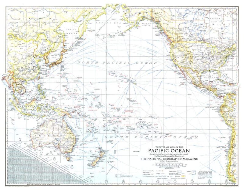 An exceptional historical piece, this map was published in February 1942 with an article entitled “Facts about the Philippines.” Time zones, ship routes, and naval bases, make this a valuable map for collectors and those interested in World War II.