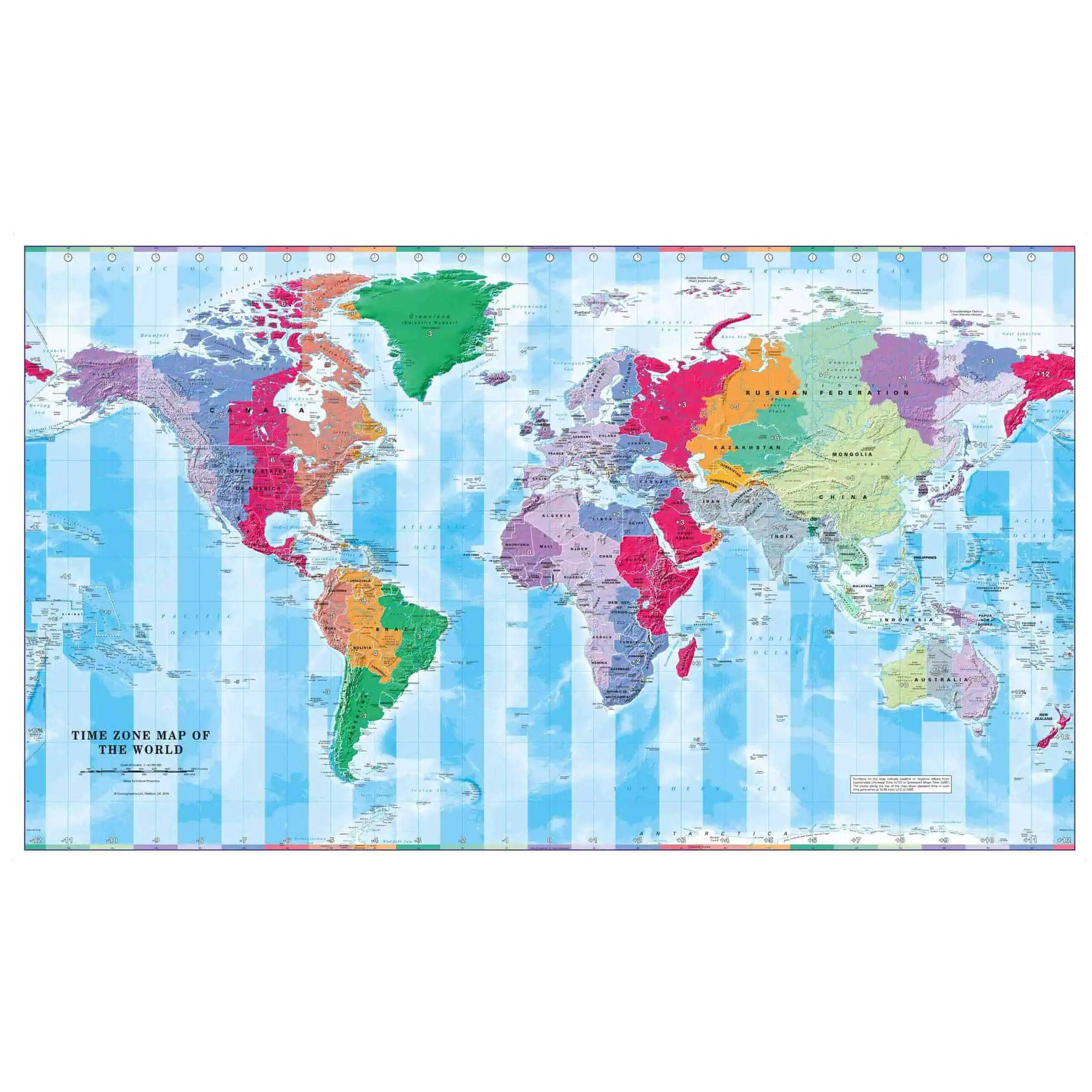 Colourful yet informative map. Combined with a detailed political map of the world, contrasting colours are used to accurately depict the different time zones, both on land and in the oceans.