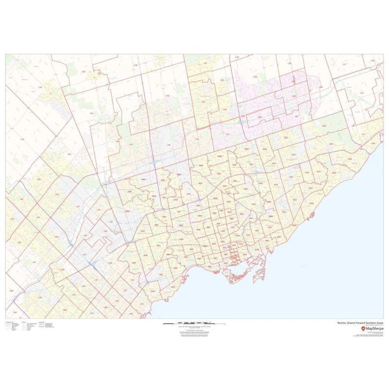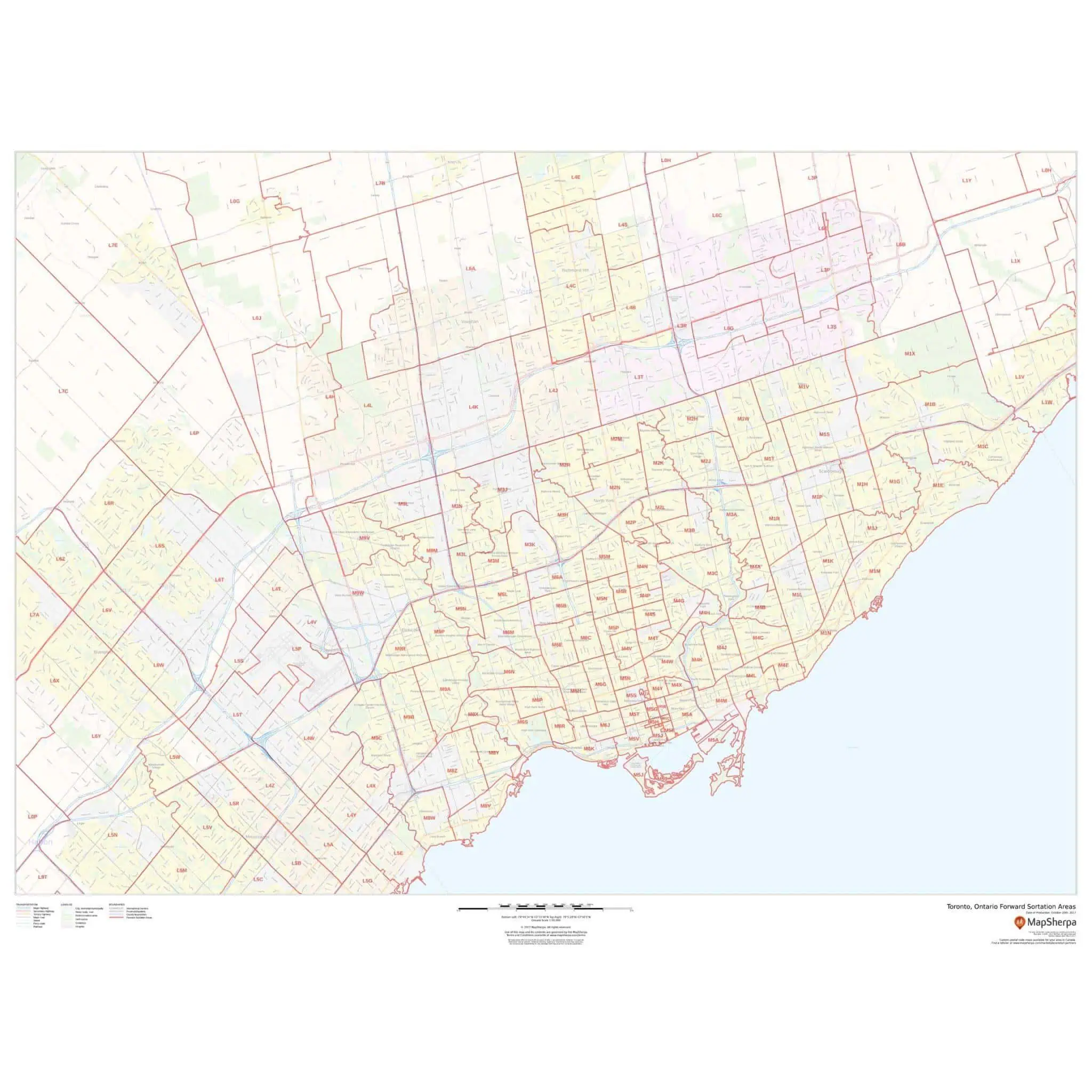 This map of Toronto shows postal code forward sortation areas overlaid on a road map. Ideal for planning of deliveries, home services, sales territories, real estate and much more. Base map features include all roads with major roads and highways labelled; neighbourhood names; railways; and high level land use such as parks and recreation areas, industrial areas and hospital campuses. 48 x 36 in