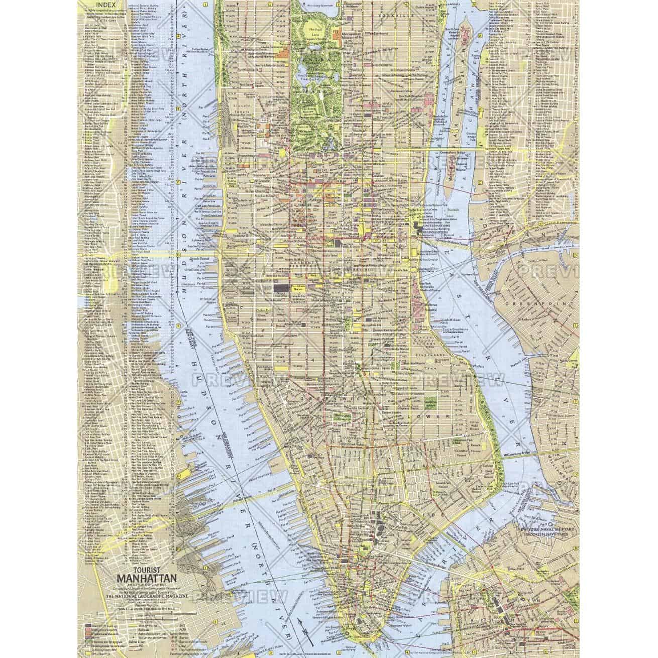 Published two years before construction began on the World Trade Center, this map provides a detailed look at Manhattan, the commercial, the financial, and cultural center of New York City. Includes a complete index, making it easy to find the many points of interest that the island borough has to offer. Published in July 1964 as part of a two-map set with “Greater New York.”