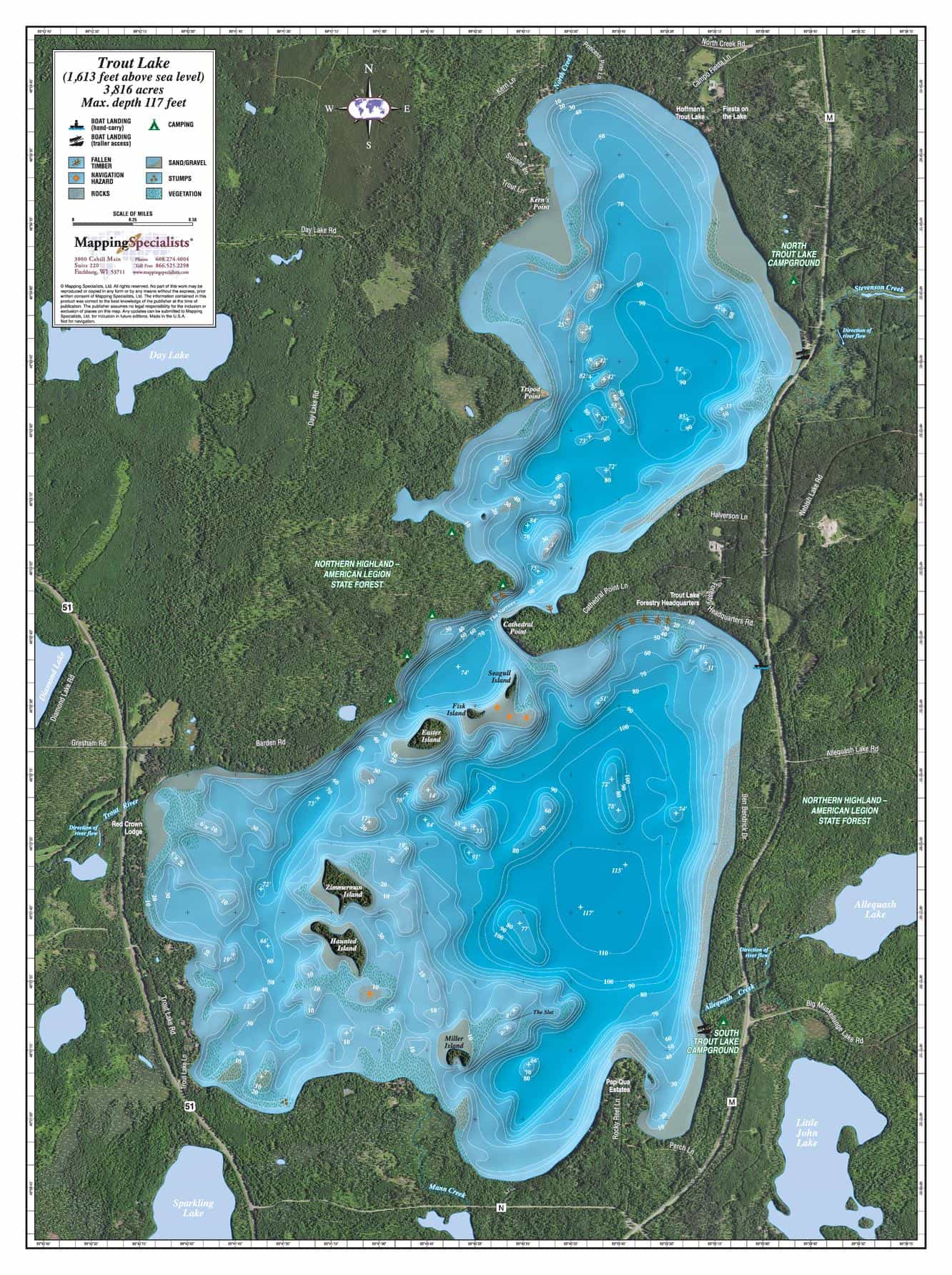 An Attractive map of the lake showing a visual 3D representation of the lake bottom. Includes boat launches, rock area and vegetation. Land area is high resolution aerial imagery.