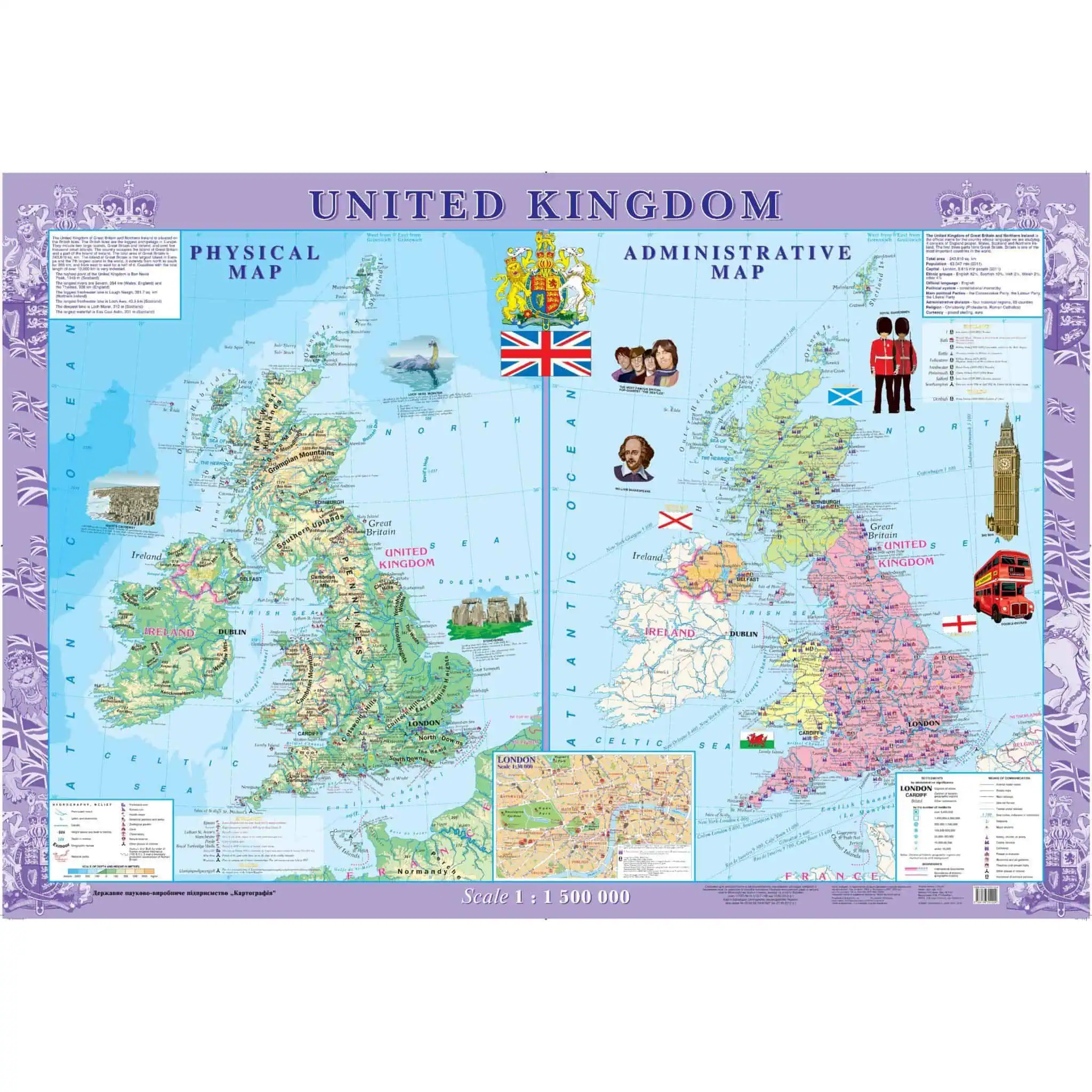 This decorative wall map of the United Kingdom includes both a physical map and a political map. Also included is an inset map of London at a scale of 1:30 000.Shown on the physical map are famous nature monuments, parks and reserves, historical and archeological features, caves, climatic spas, zoos and other interesting features.The political map highlights the four kingdoms that make up the country; England, Scotland, Wales and Northern Ireland. Features of interests identified on the map include architectural and historical monuments, middle age abbeys, palaces and castles, museums and theaters, places of birth of prominent people and other interesting features.