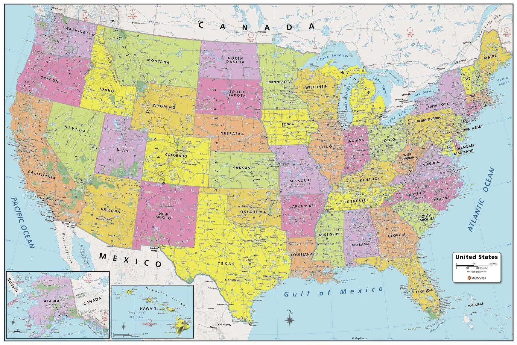 Created specifically for MapSherpa, this United States Political Map stretches from the Pacific to the Atlantic Oceans, and the Gulf of Mexico to international neighbor borders, this US Political Map displays all 50 states that make up the country. For readability, each state is easily identified by a different color, the map prominently shows; State capitals, primary cities & towns, major national parks, primary water features, mountain ranges and all time zones. With multiple sizes available, this is the perfect reference map for home, office, or school use.