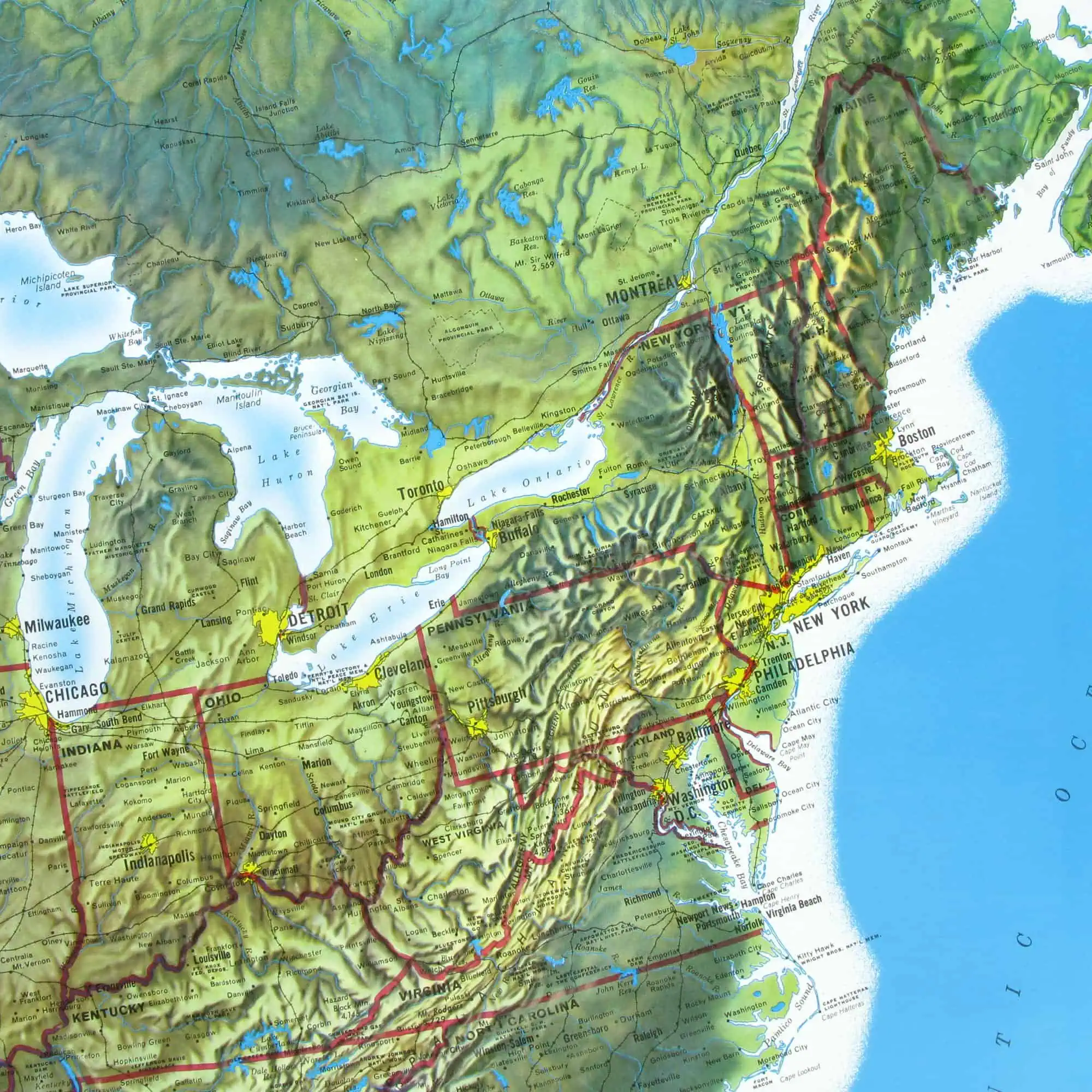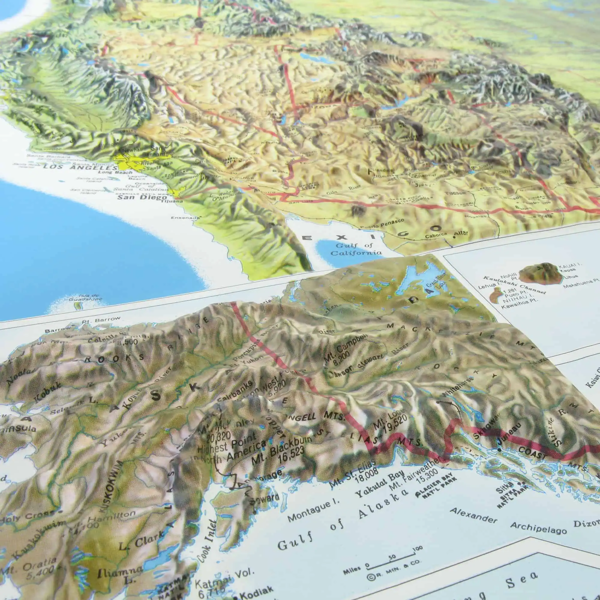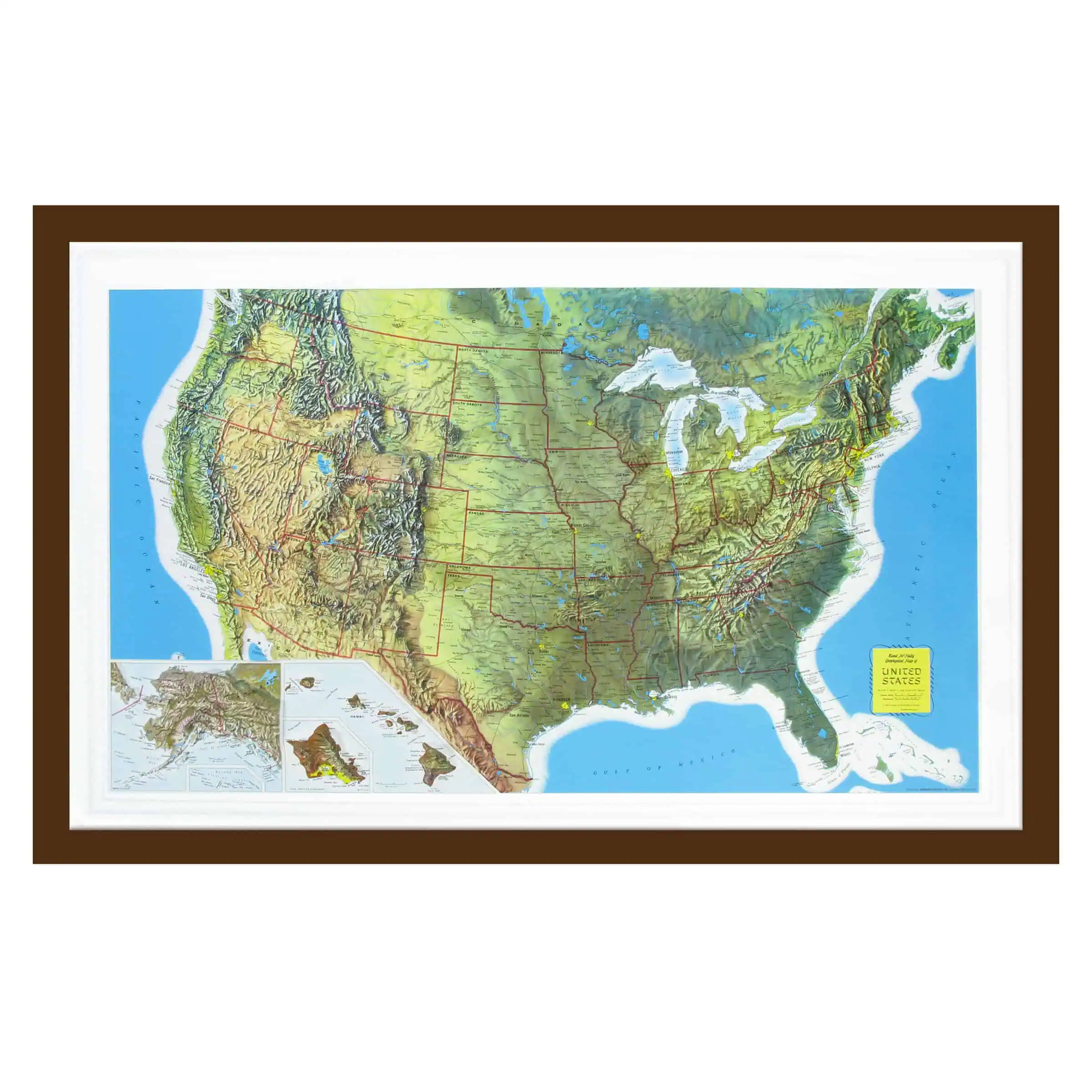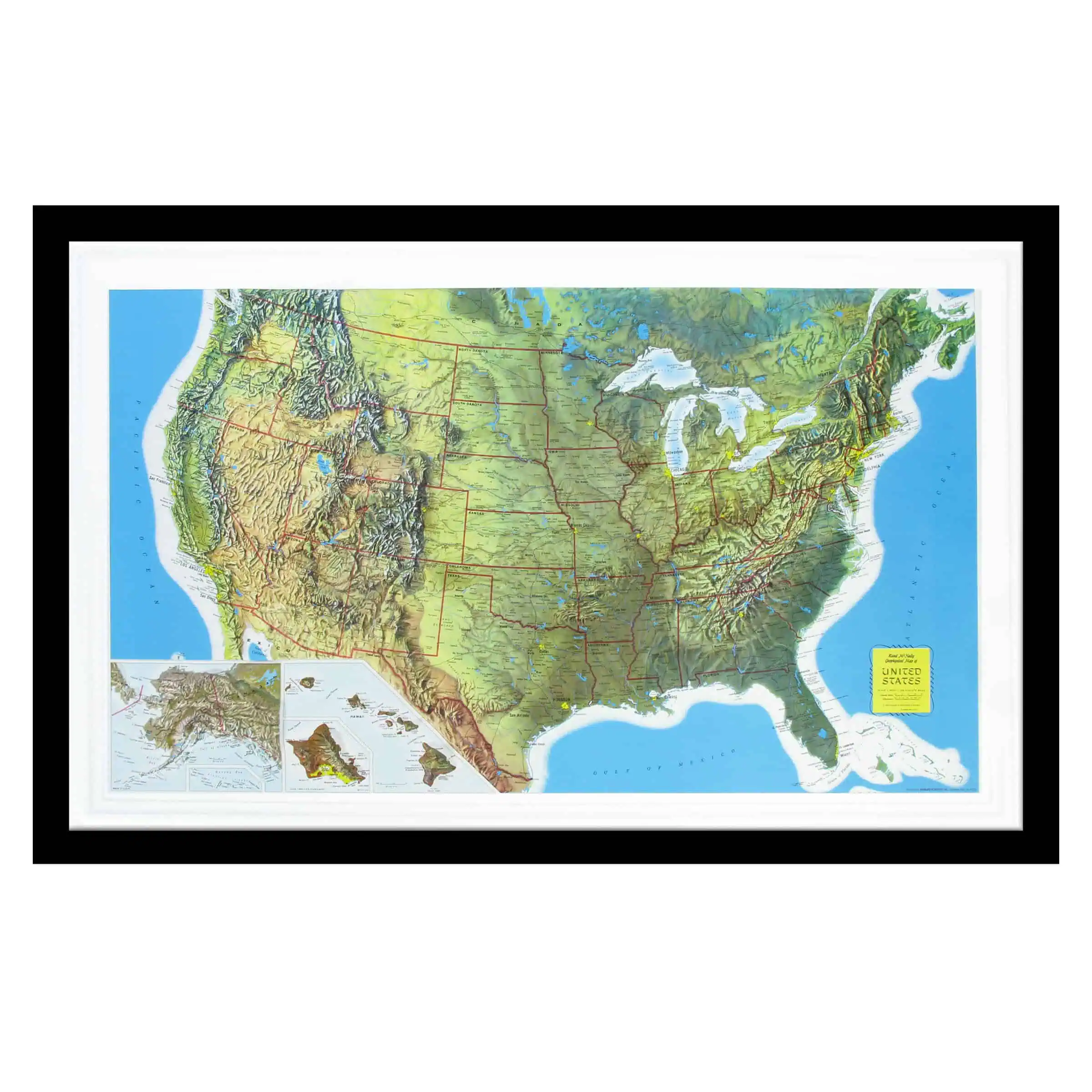 3D raised relief map of the United States with unframed dimensions of 34.5″x22″. This map is printed on 2mm thick high-grade rigid vinyl, then one of our technical artists heat-treats and vacuum-forms each individual print over the Rand McNally US mold. Showcase the United States and it’s state boundary lines with a one-of-a-kind and fun to touch 3D raised relief map. It’s wall art, it’s a sculpture, and it’s a functional map!