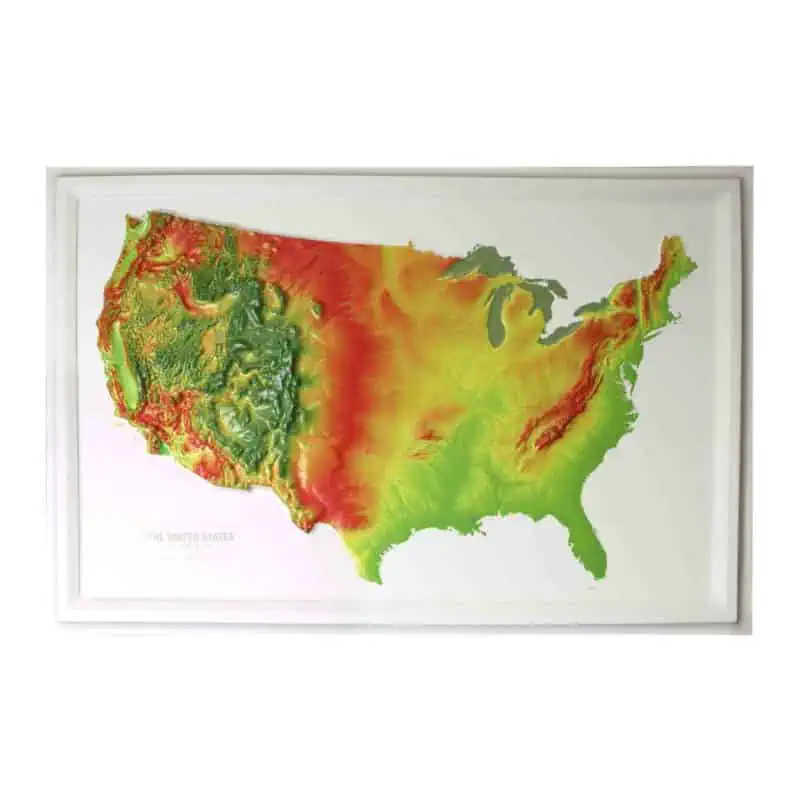 Maps are printed on 15-mil vinyl and heat-formed over a mold to create the 3D relief effect. Maps are then affixed with adhesive onto 1/4″-thick foam core. Mounting offers additional protection by keeping the map flat and rigid. All Raised Relief maps ship flat in protective boxes to preserve the 3D details. Please note that these maps are not standard frame sizes, so our custom framing option is often more cost-effective than local framing.