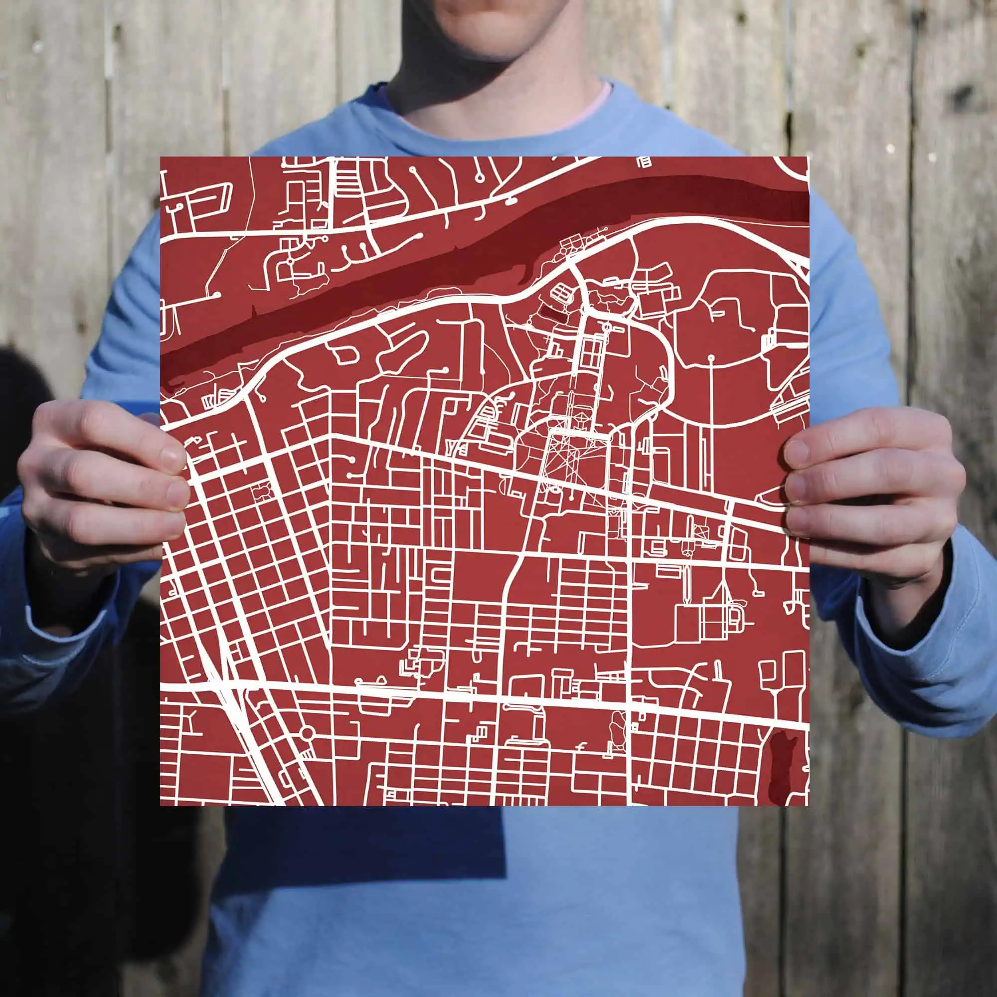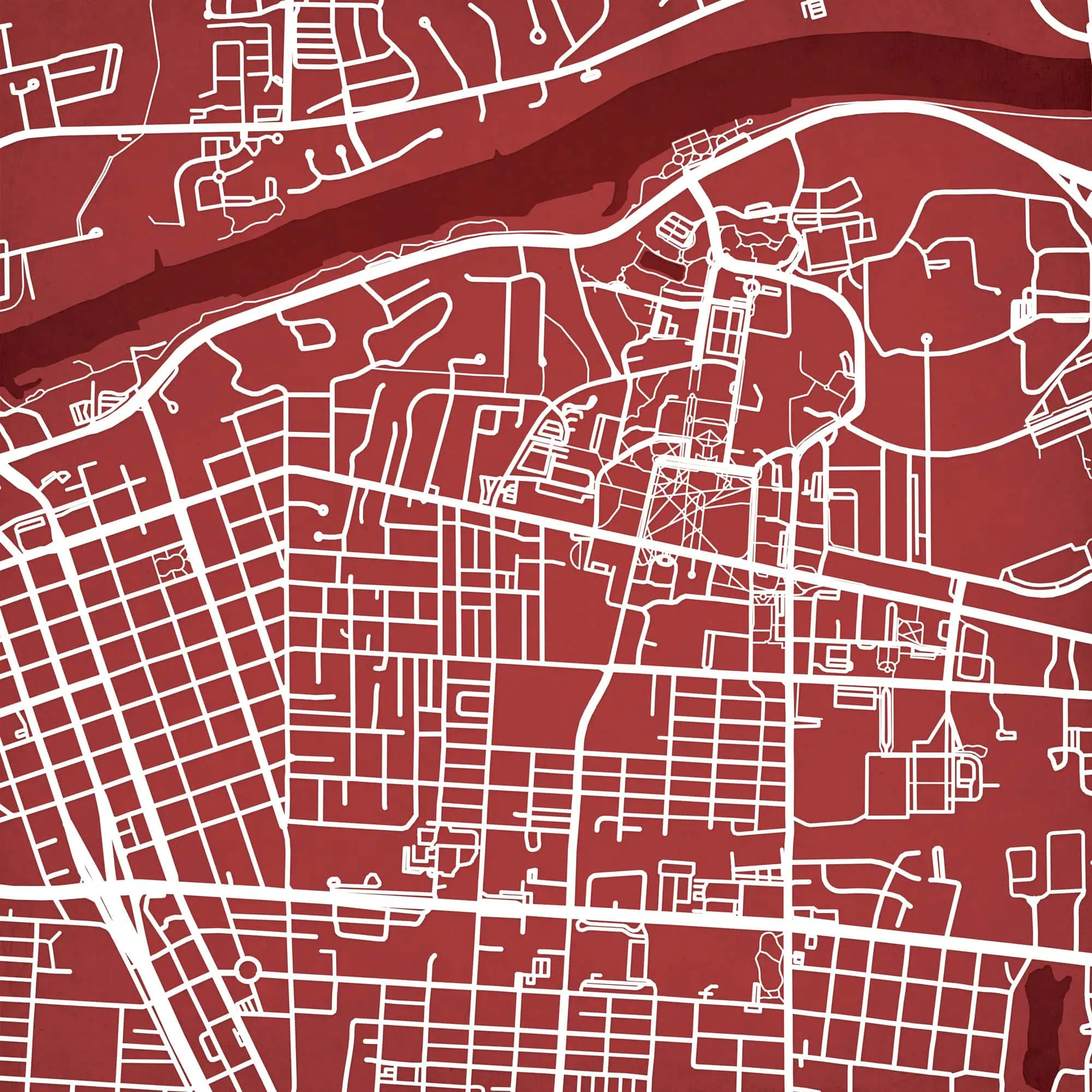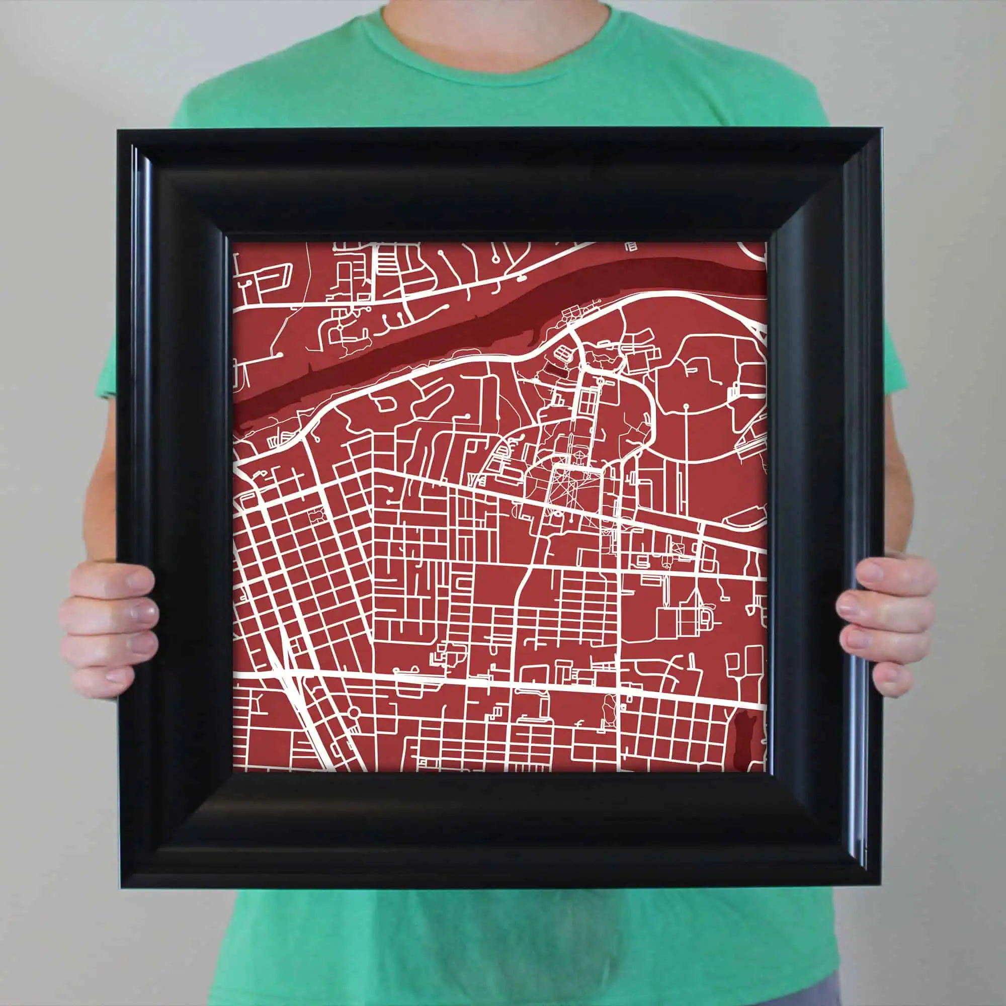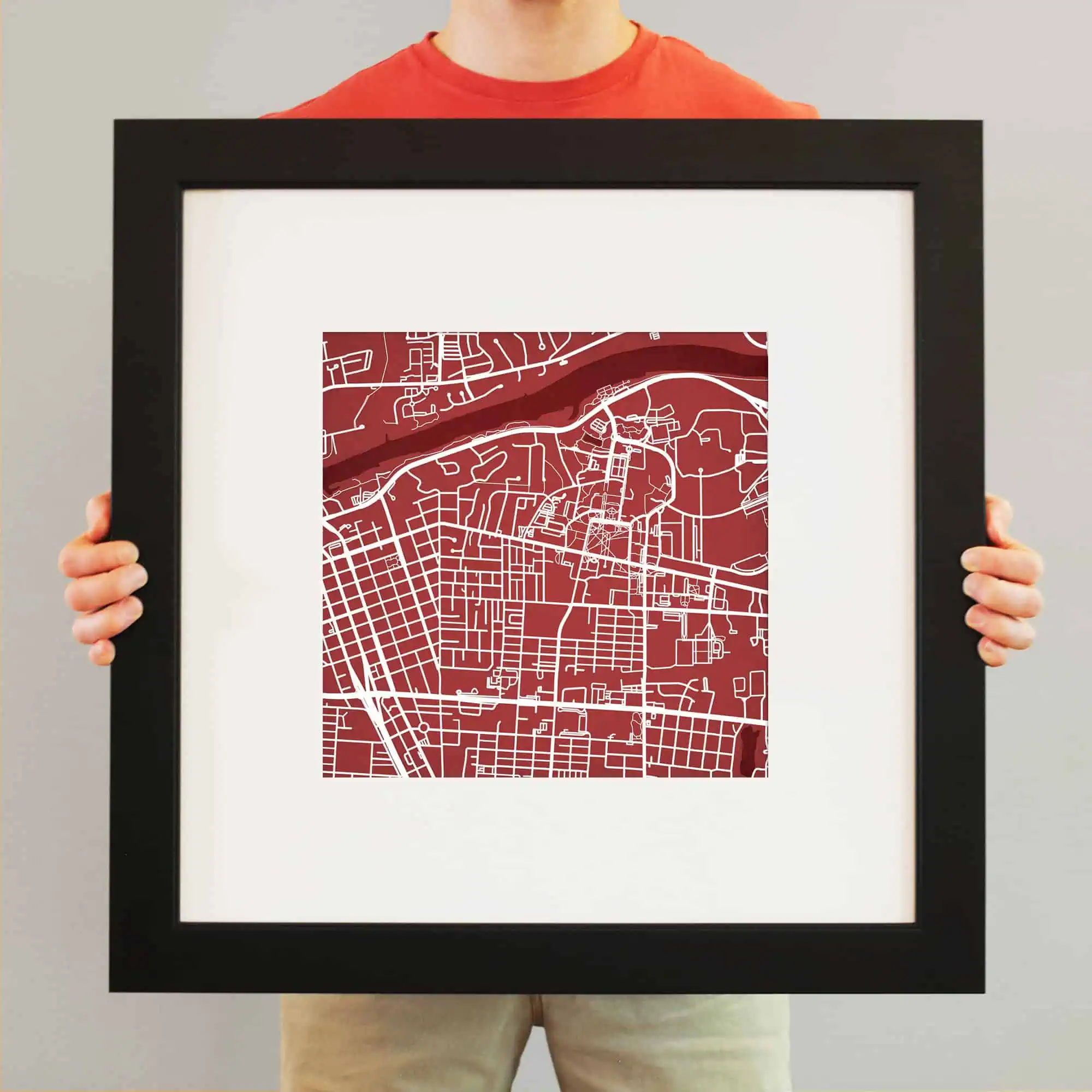 Map art print including the University of Alabama campus located in Tuscaloosa, Alabama.