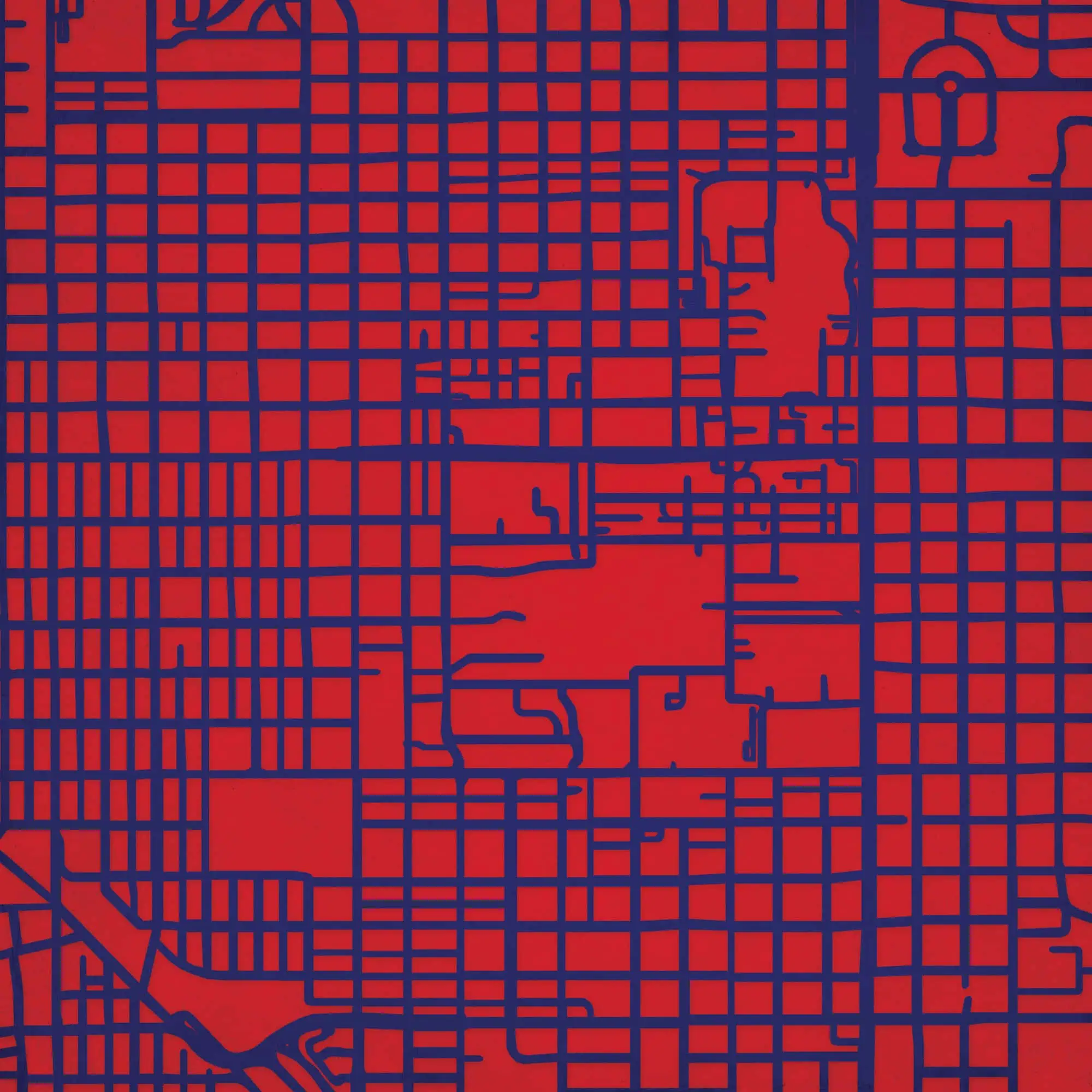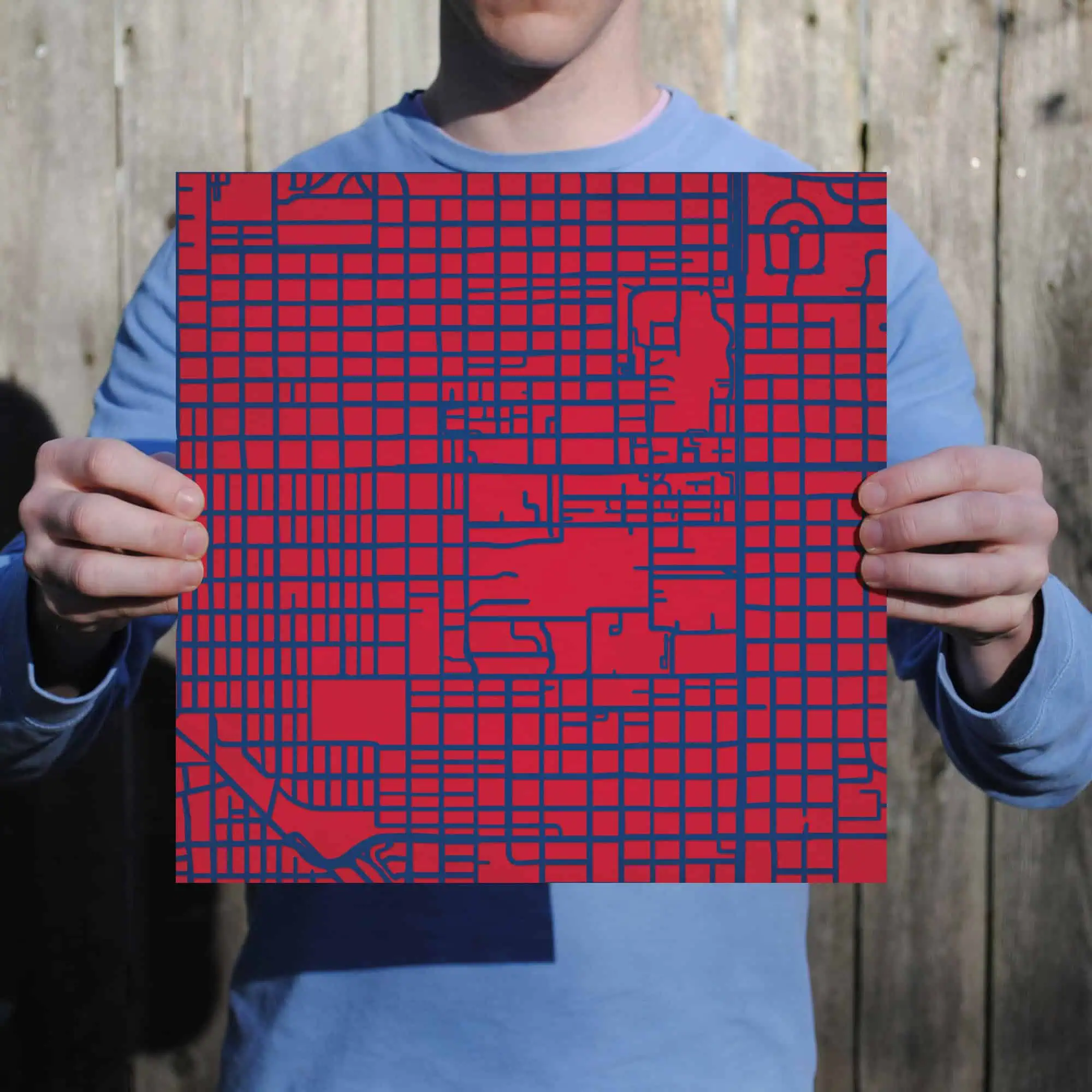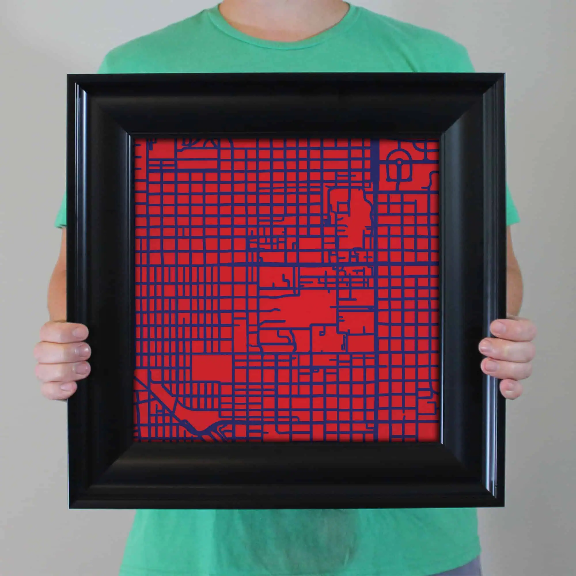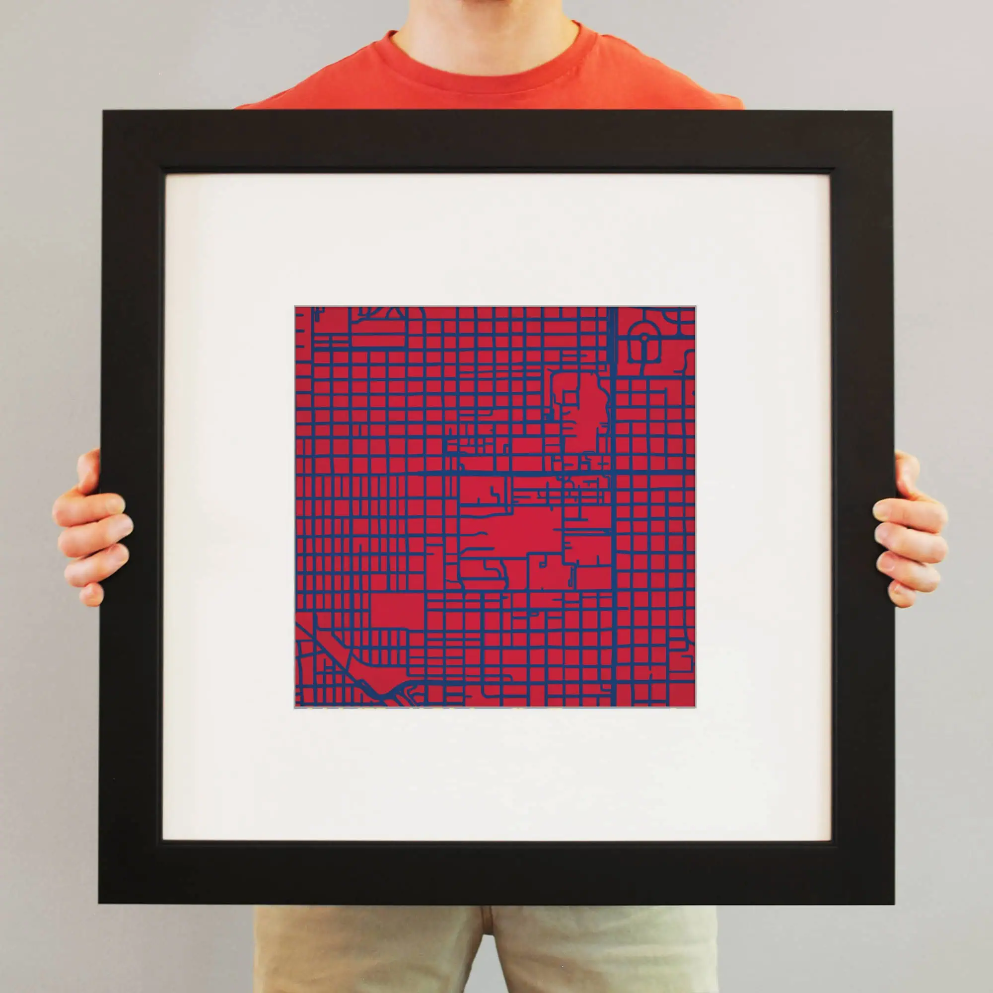 Colorful city map wall art featuring prominent street layouts and urban design, perfect for home or office decor, highlighting city navigation and geographic features.