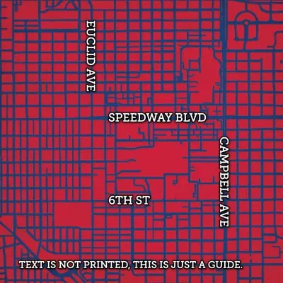 Map art print including the University of Arizona campus located in Tucson, Arizona.
