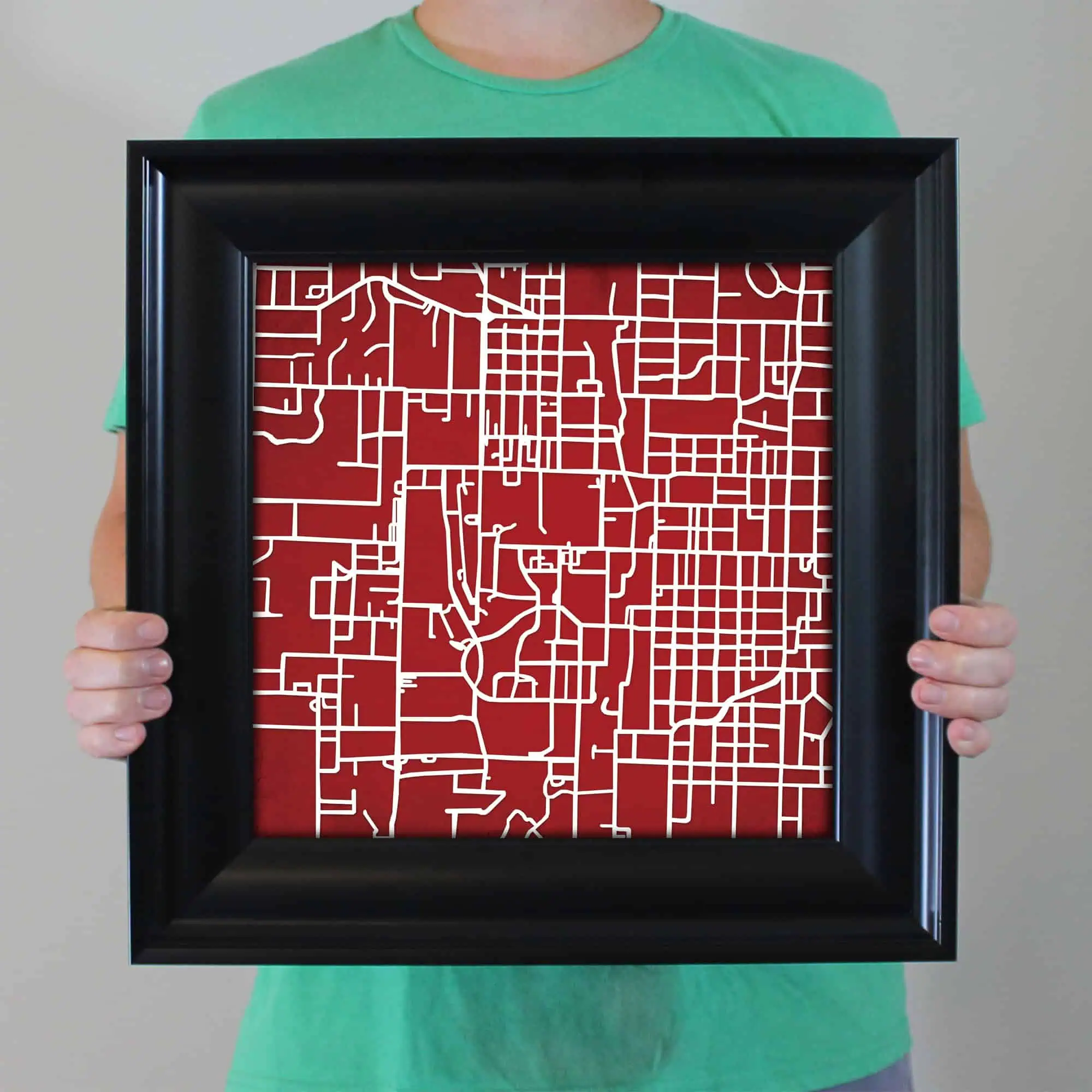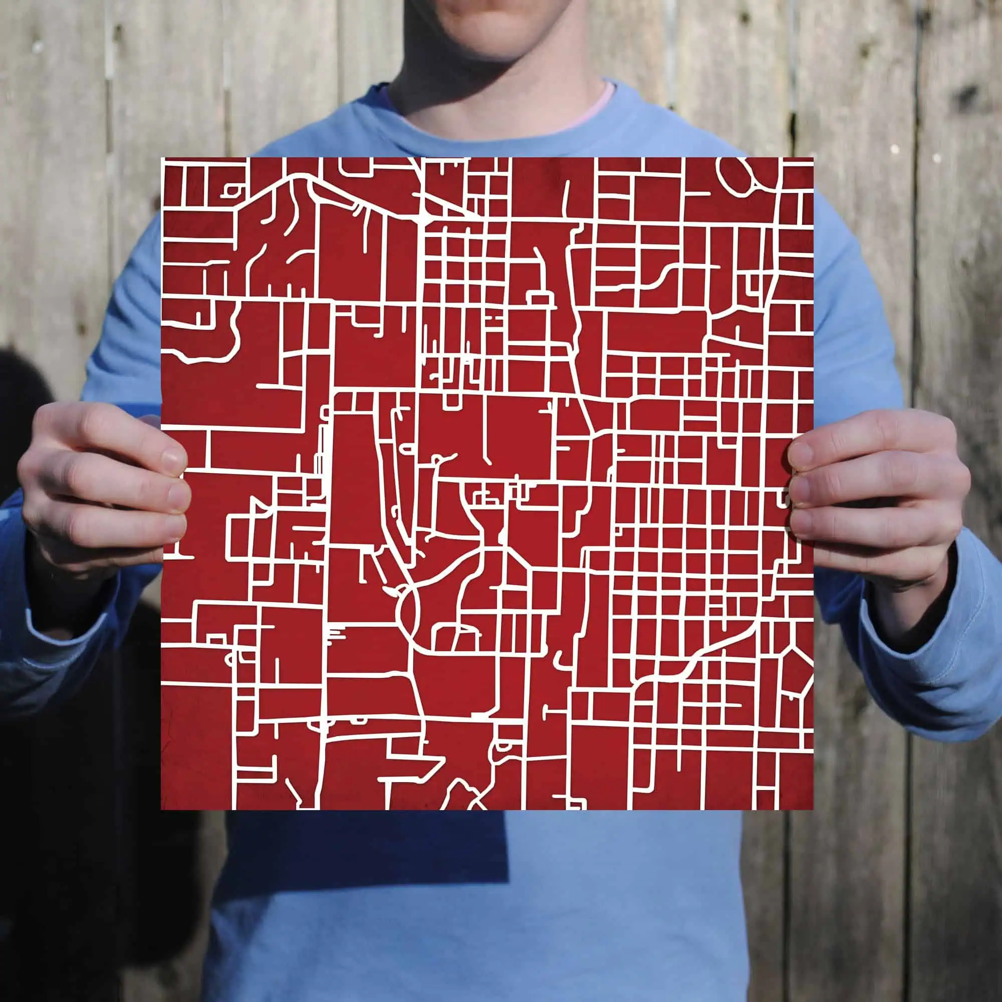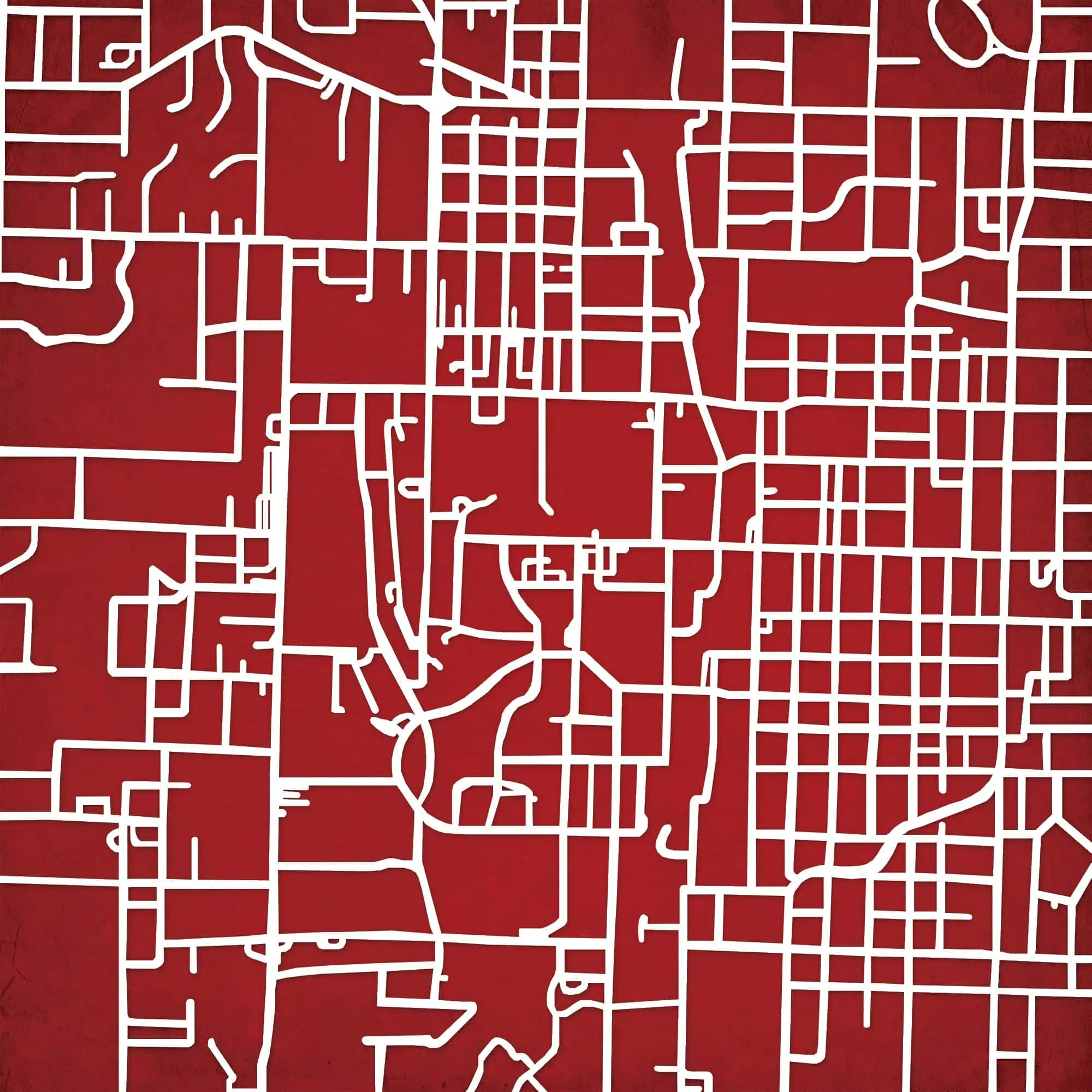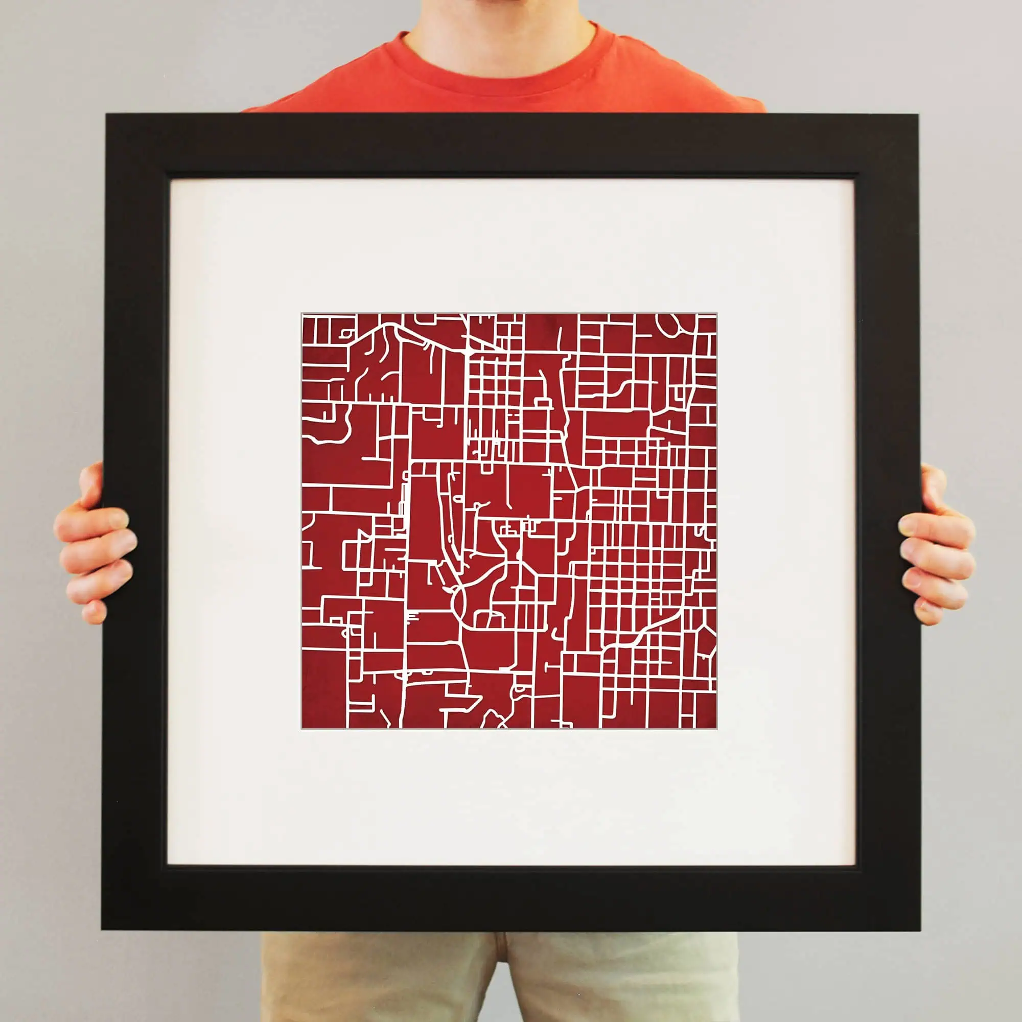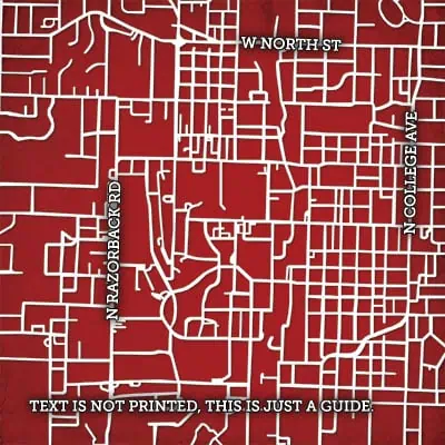 Map art print including the University of Arkansas campus located in Fayetteville, Arkansas.