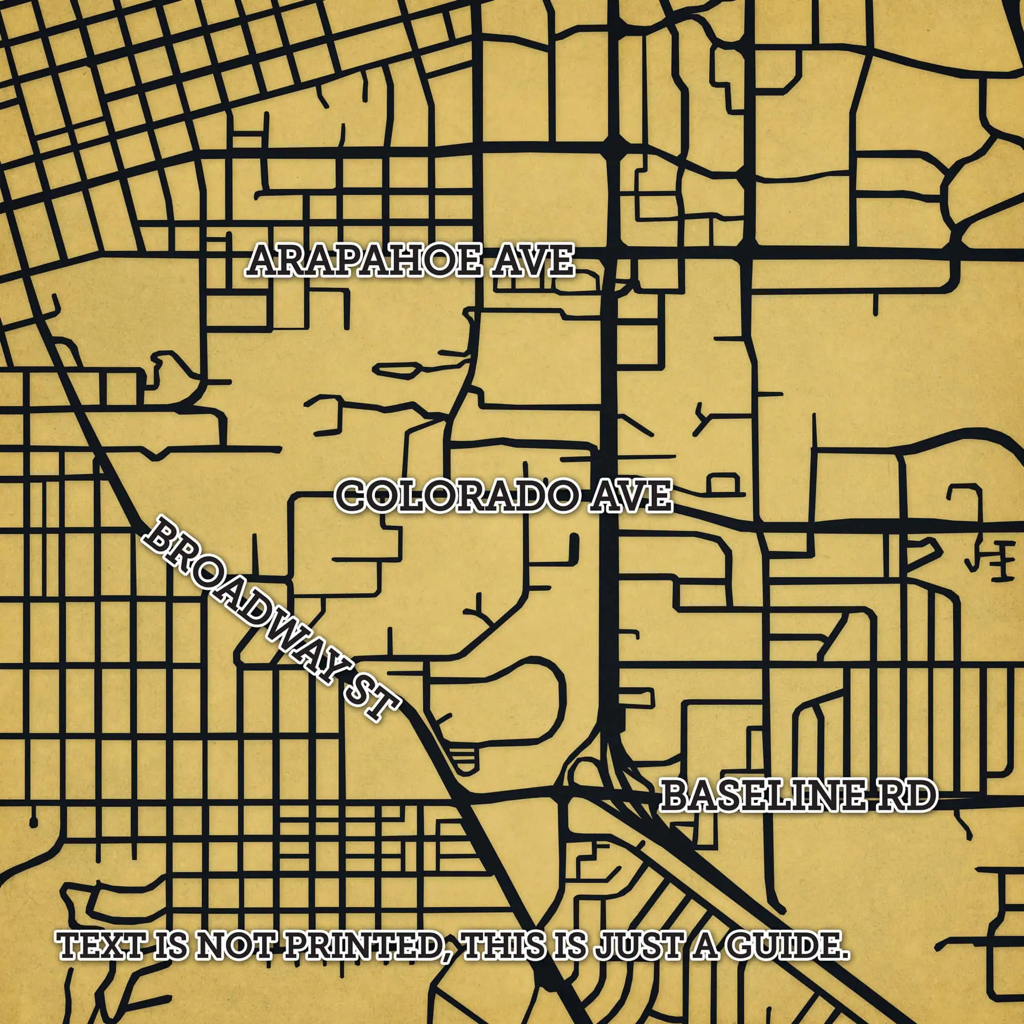 Map art print including the University of Colorado Boulder campus located in Boulder, Colorado.