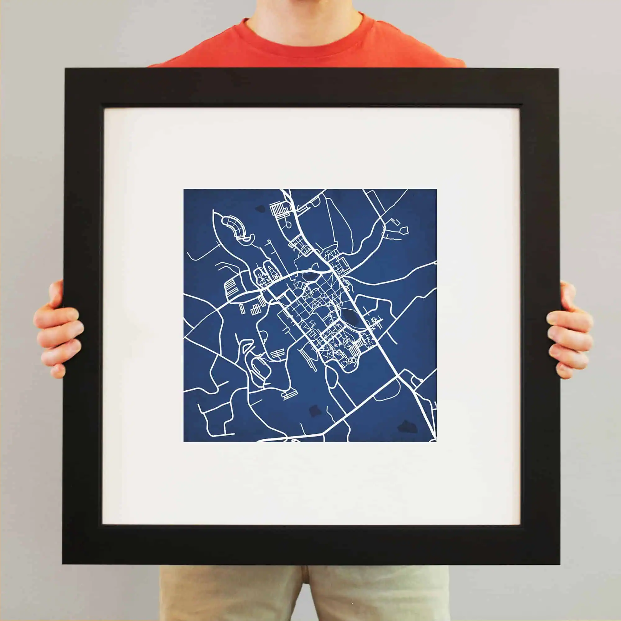 The size of this frame will vary depending on the size of the map you created. Frames are 23″ x 23″ for 12″ x 12″ prints and frames are 15.75″ x 19.75″ for 12″ x 16″ maps. Both frames have a black 1.75” wide genuine-wood molding. The print is enhanced with a soft white acid-free mat, which is bevel cut and placed on top of the print. The print and matt are protected by a premium crystal-clear acrylic overlay. The back of the frame is sealed with a dust cover for added protection. Industrial silver hanging hardware is bolted to the back of the frame so it’s ready to hang on your wall.