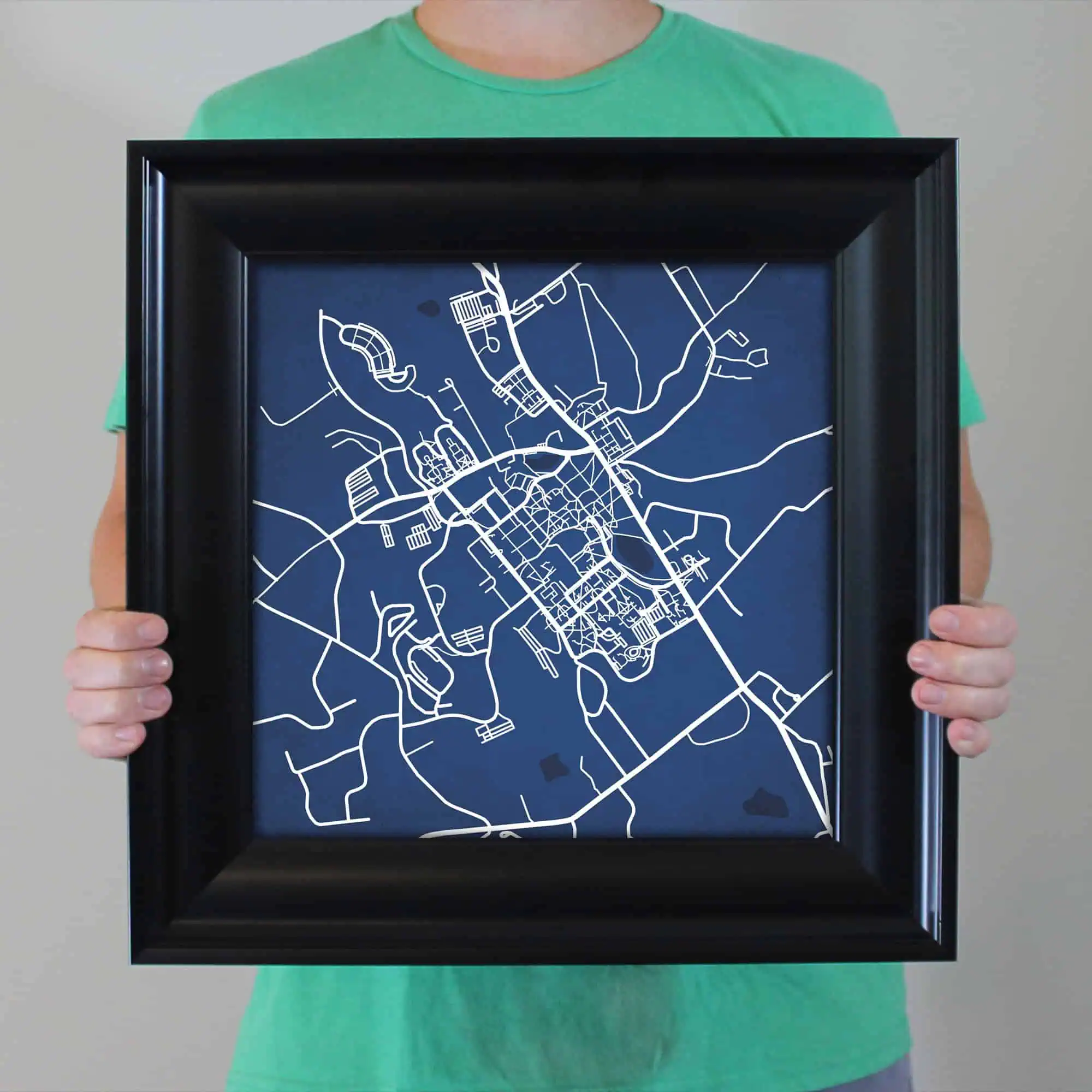 The size of this frame will vary depending on the size of the map you created. Frames are 16.5″ x 16.5″ for 12″ x 12″ prints and frames are 16.5″ x 20.5″ for 12″ x 16″ maps. Our frames have a black 2.75” wide heavy polystyrene molding. We choose to mount the prints without a glass/acrylic overlay, which shows off the unique properties of our paper stock when it hits the light. The back of the frame is sealed with a dust cover for added protection. Industrial silver hanging hardware is fixed to the back of the frame so it’s ready to hang on your wall.