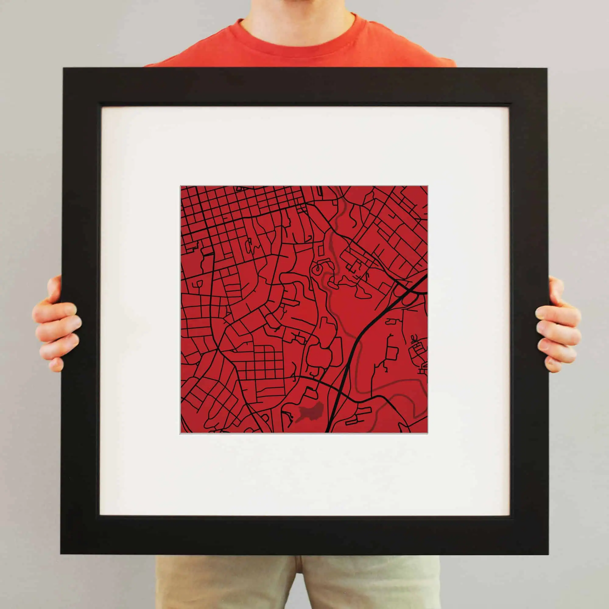 The size of this frame will vary depending on the size of the map you created. Frames are 23″ x 23″ for 12″ x 12″ prints and frames are 15.75″ x 19.75″ for 12″ x 16″ maps. Both frames have a black 1.75” wide genuine-wood molding. The print is enhanced with a soft white acid-free mat, which is bevel cut and placed on top of the print. The print and matt are protected by a premium crystal-clear acrylic overlay. The back of the frame is sealed with a dust cover for added protection. Industrial silver hanging hardware is bolted to the back of the frame so it’s ready to hang on your wall.