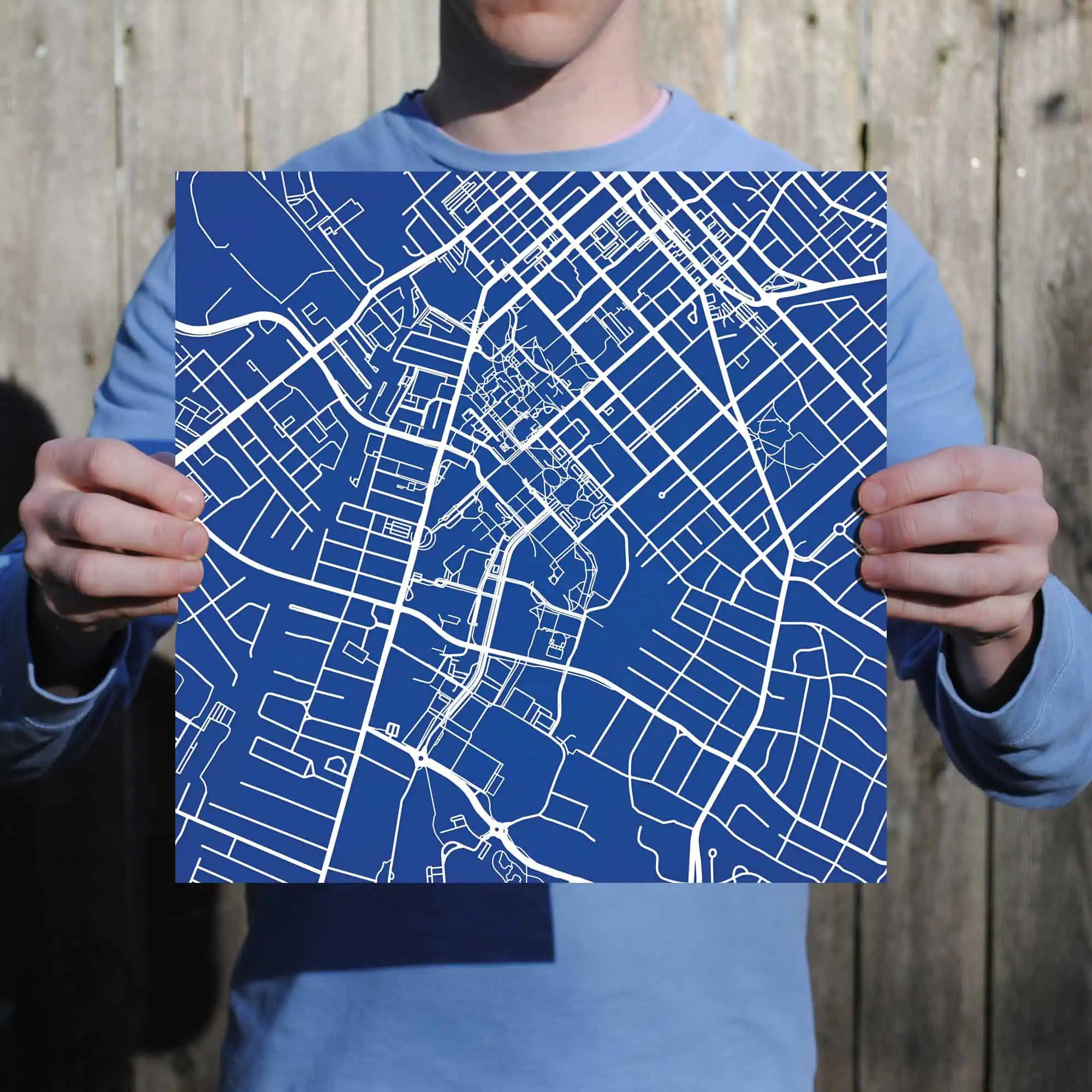 Colorful city map wall art featuring prominent street layouts and urban design, perfect for home or office decor, highlighting city navigation and geographic features.