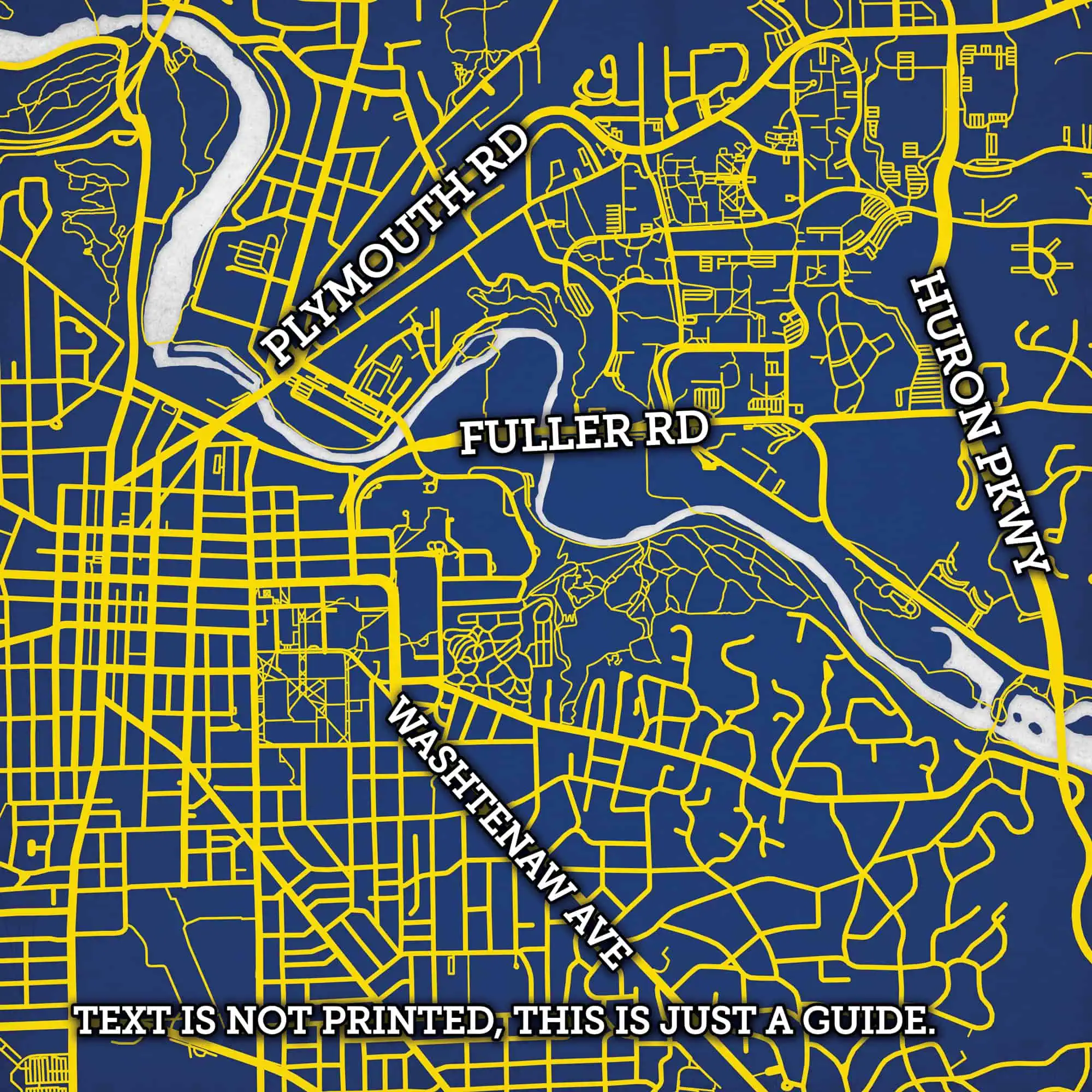 Map art print including the University of Michigan campus located in Ann Arbor, Michigan.