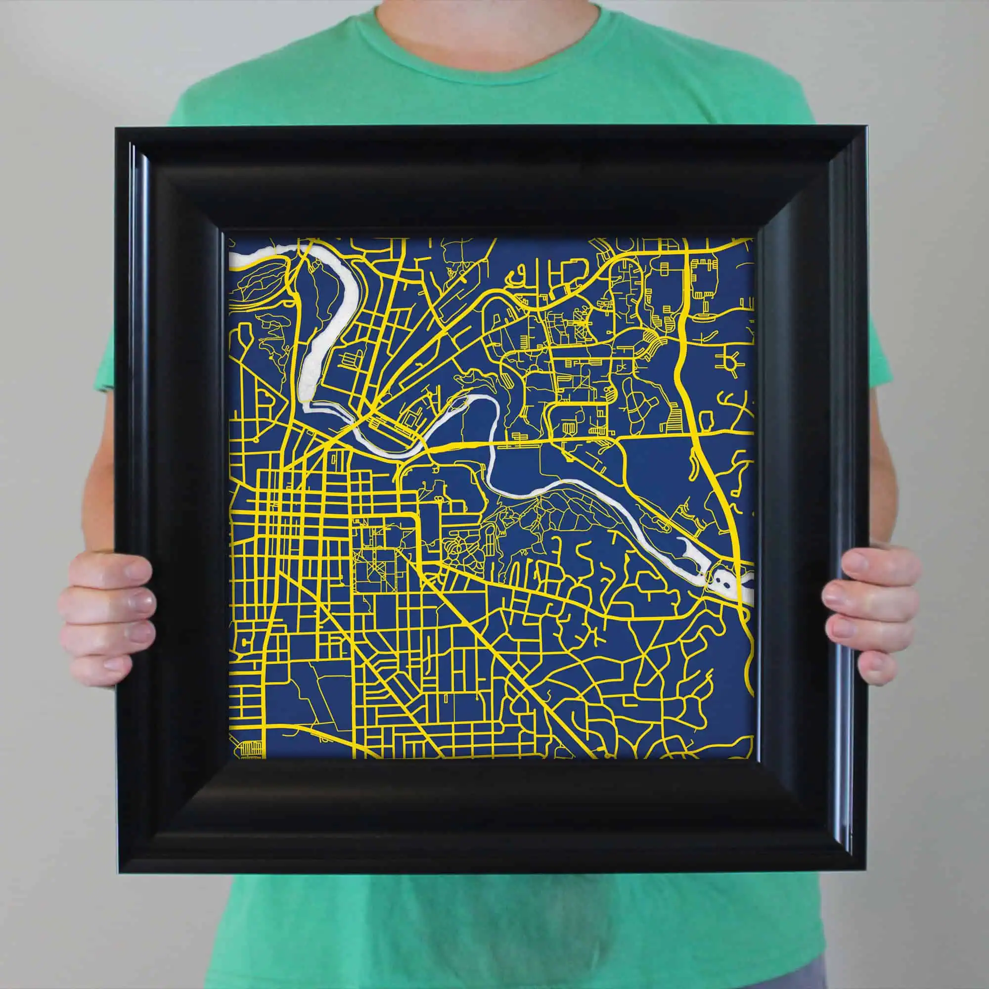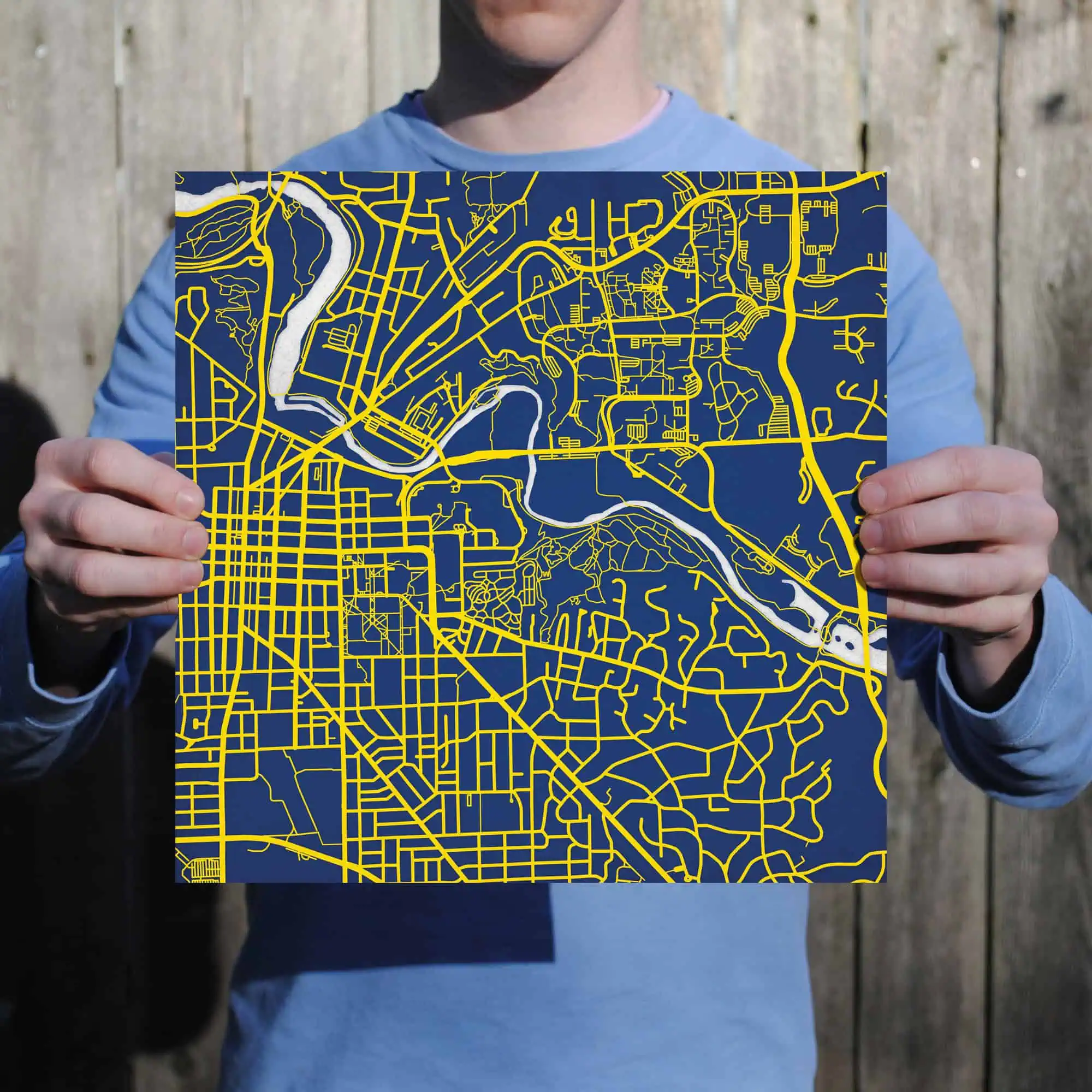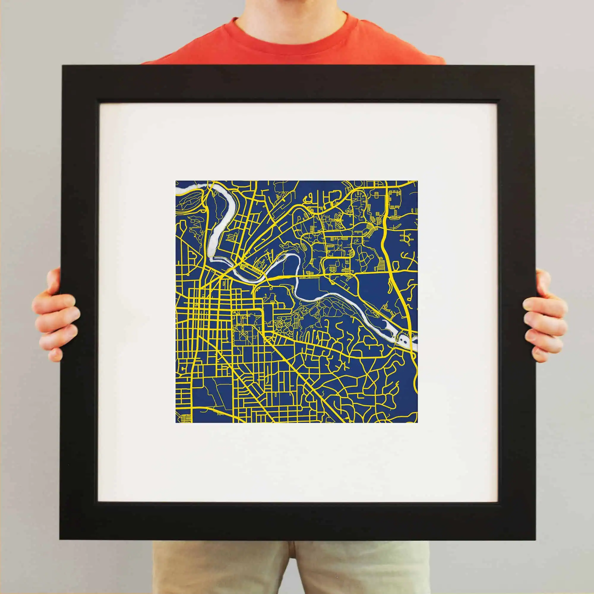 Colorful city map wall art featuring prominent street layouts and urban design, perfect for home or office decor, highlighting city navigation and geographic features.