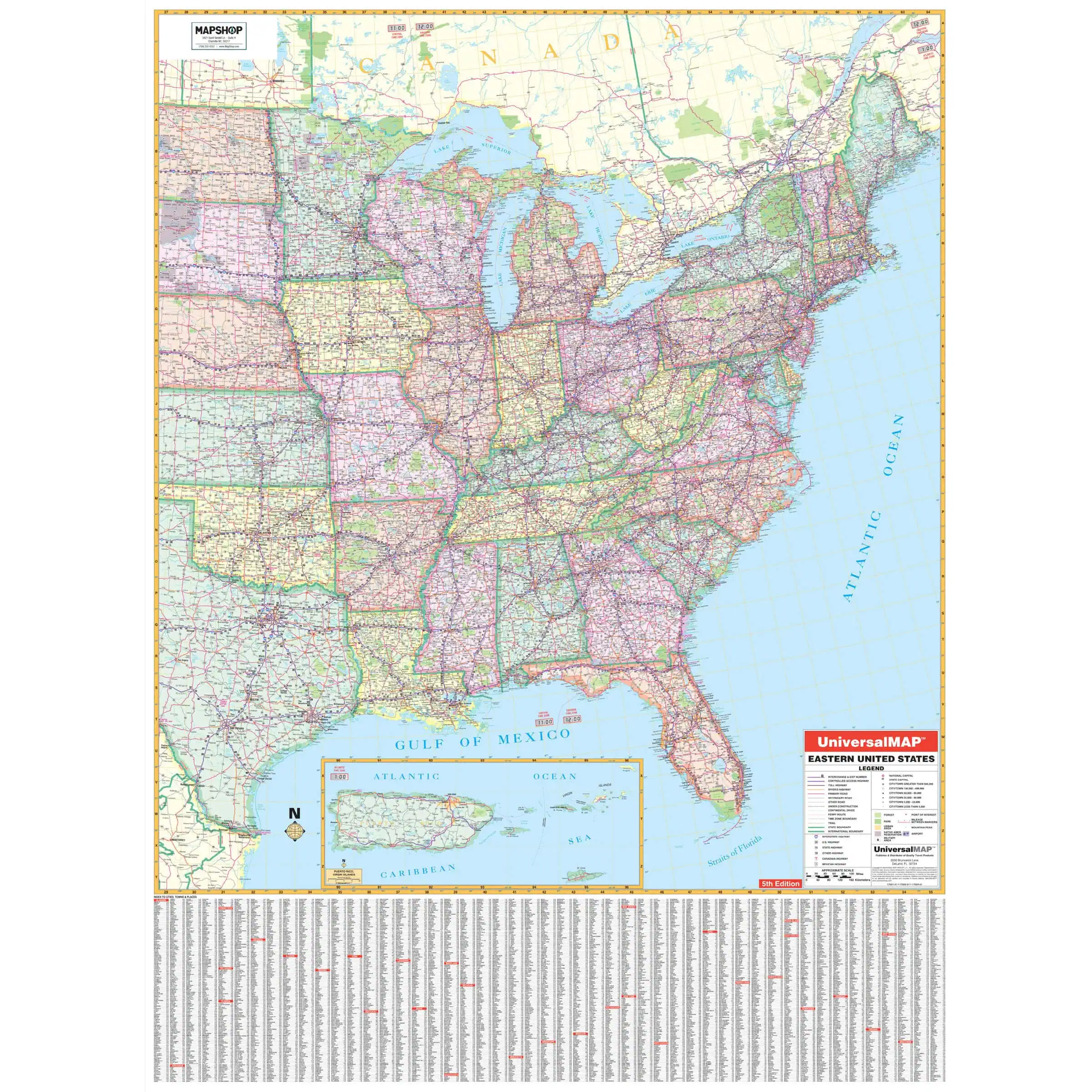 The Eastern United States Regional Wall Map by Kappa Map Group encompasses a vast area from the Mississippi River to the Atlantic Ocean, detailing the extensive road systems of the eastern half of the United States. It includes state boundaries, highway systems, and major waterways such as the Great Lakes and the Gulf of Mexico. A large index on the lower part of the map provides a comprehensive listing of cities and towns, with associated grid coordinates for easy location identification. An inset of Puerto Rico and the US Virgin Islands is also included. This map serves as a functional guide for educational use, travel planning, and for businesses that require a broad geographic understanding of the eastern United States.
