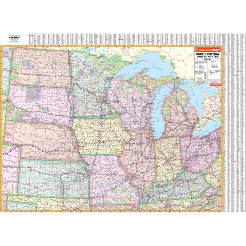 The North Central United States Regional Wall Map by Kappa Map Group displays a detailed network of highways, major roads, and state boundaries across the north-central region of the United States. It covers a wide geographic area, including the states surrounding the Great Lakes, down through the plains states to the southern borders of Missouri and Kansas. An extensive index along the map’s sides lists cities and towns, which is matched with a grid for easy reference and navigation. The map also shows the topographical variations of the region, from the rugged northern landscapes to the expansive central plains, providing viewers with a comprehensive understanding of the area’s physical and human geography. This map is designed to serve the needs of travelers, educators, and professionals who require a broad and detailed overview of the north-central part of the United States.