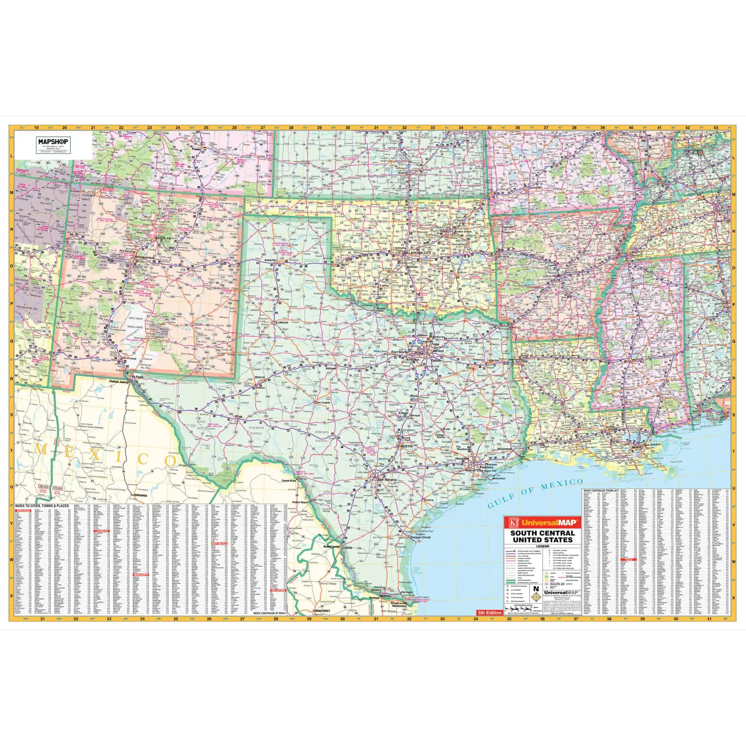 The South Central United States Regional Wall Map by Kappa Map Group offers an expansive view of the south-central region, including Texas, Oklahoma, Arkansas, and Louisiana. It displays a comprehensive network of highways, roads, and important landmarks, as well as state and international borders. The map features insets of major metropolitan areas for a more detailed urban road layout, and an extensive index of cities and towns is provided along the bottom, enabling easy navigation across the region. The Gulf of Mexico coastline is clearly depicted, highlighting ports and coastal cities. This map is a functional guide for those traveling through or conducting business in the south-central United States, as well as for educators and others who need a detailed regional reference.
