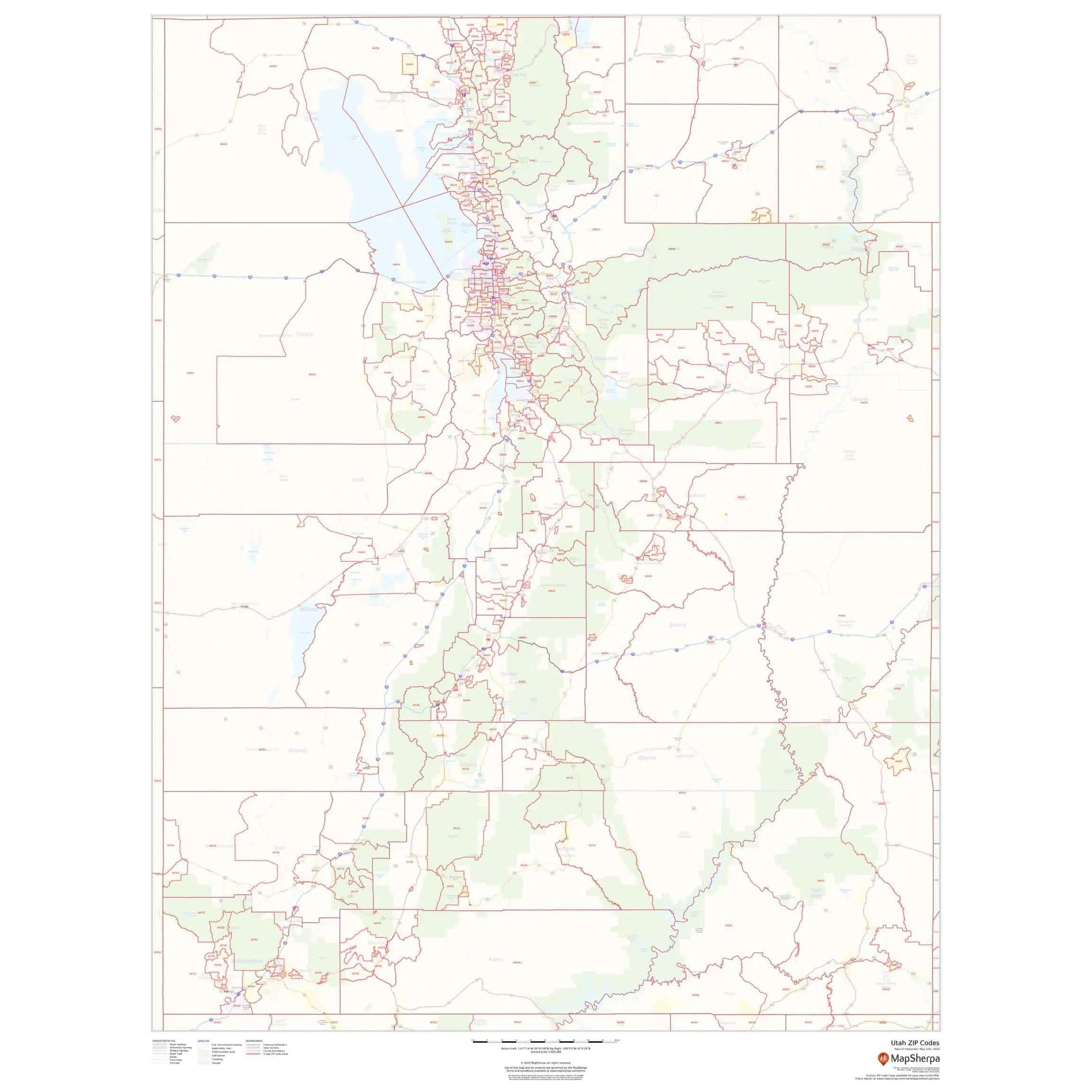 This map of Utah shows zip codes overlaid on a road map. Base map features include municipality and county boundaries, major road network features, and state and national parks and conservation areas.
