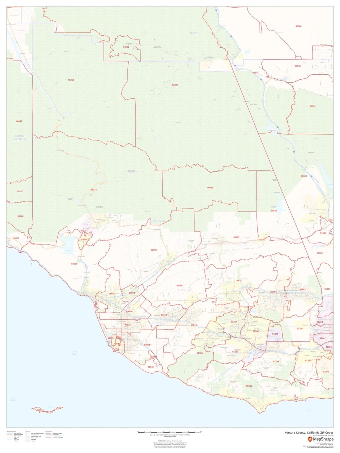 This map of the mainland portion of Ventura County, California shows ZIP code areas overlaid on a road map. Ideal for planning of deliveries, home ervices, sales territories, real estate and much more. Base map features include all roads with major roads and highways labelled; neighborhood names; railways; and high level land use such as parks and recreation areas, industrial areas and hospital campuses.