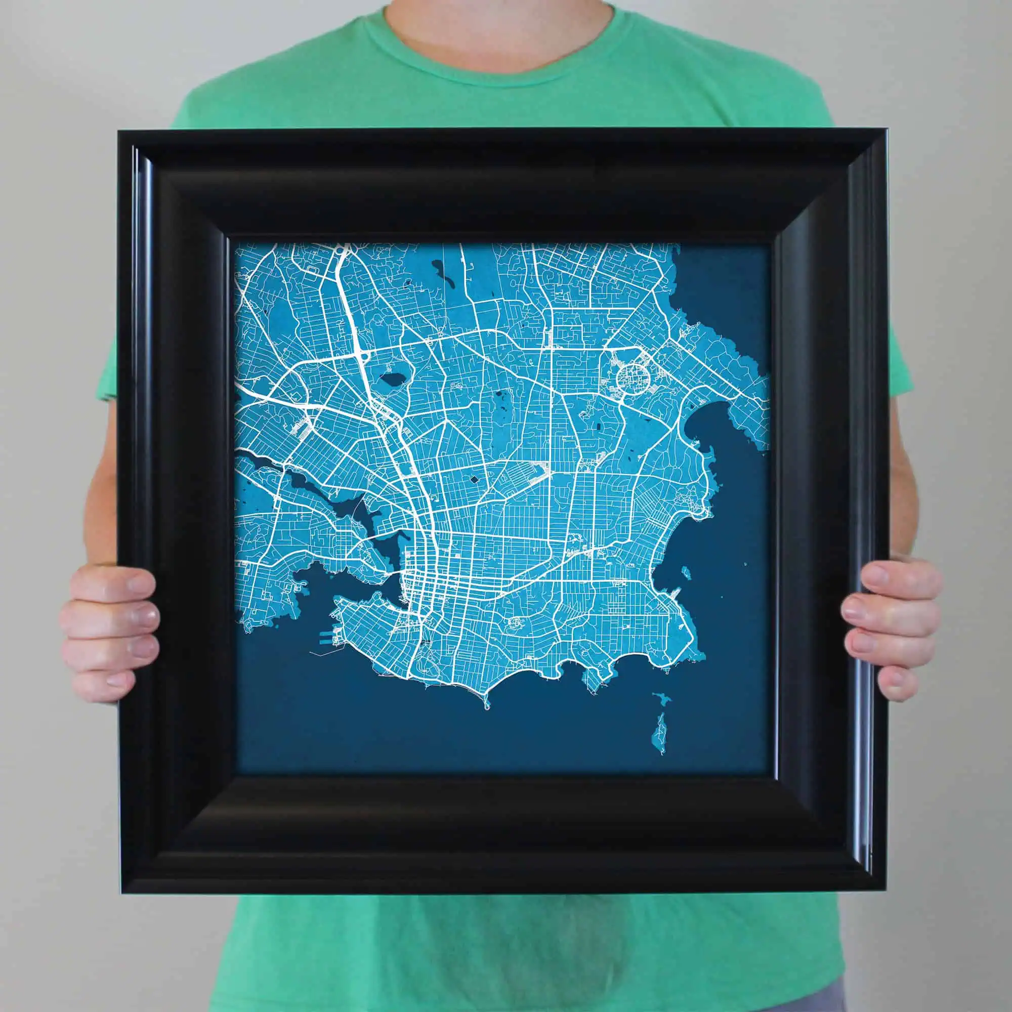 The size of this frame will vary depending on the size of the map you created. Frames are 16.5″ x 16.5″ for 12″ x 12″ prints and frames are 16.5″ x 20.5″ for 12″ x 16″ maps. Our frames have a black 2.75” wide heavy polystyrene molding. We choose to mount the prints without a glass/acrylic overlay, which shows off the unique properties of our paper stock when it hits the light. The back of the frame is sealed with a dust cover for added protection. Industrial silver hanging hardware is fixed to the back of the frame so it’s ready to hang on your wall.