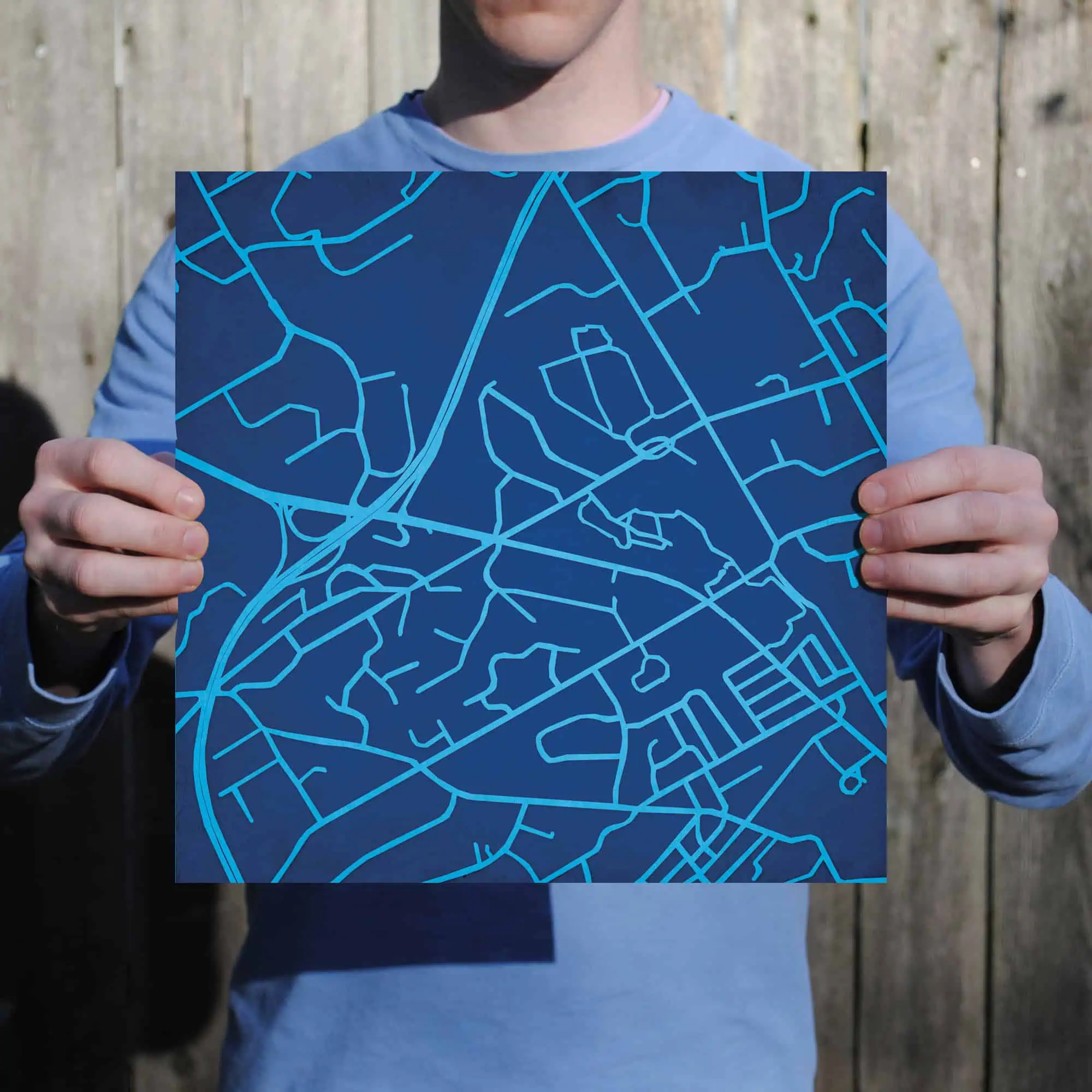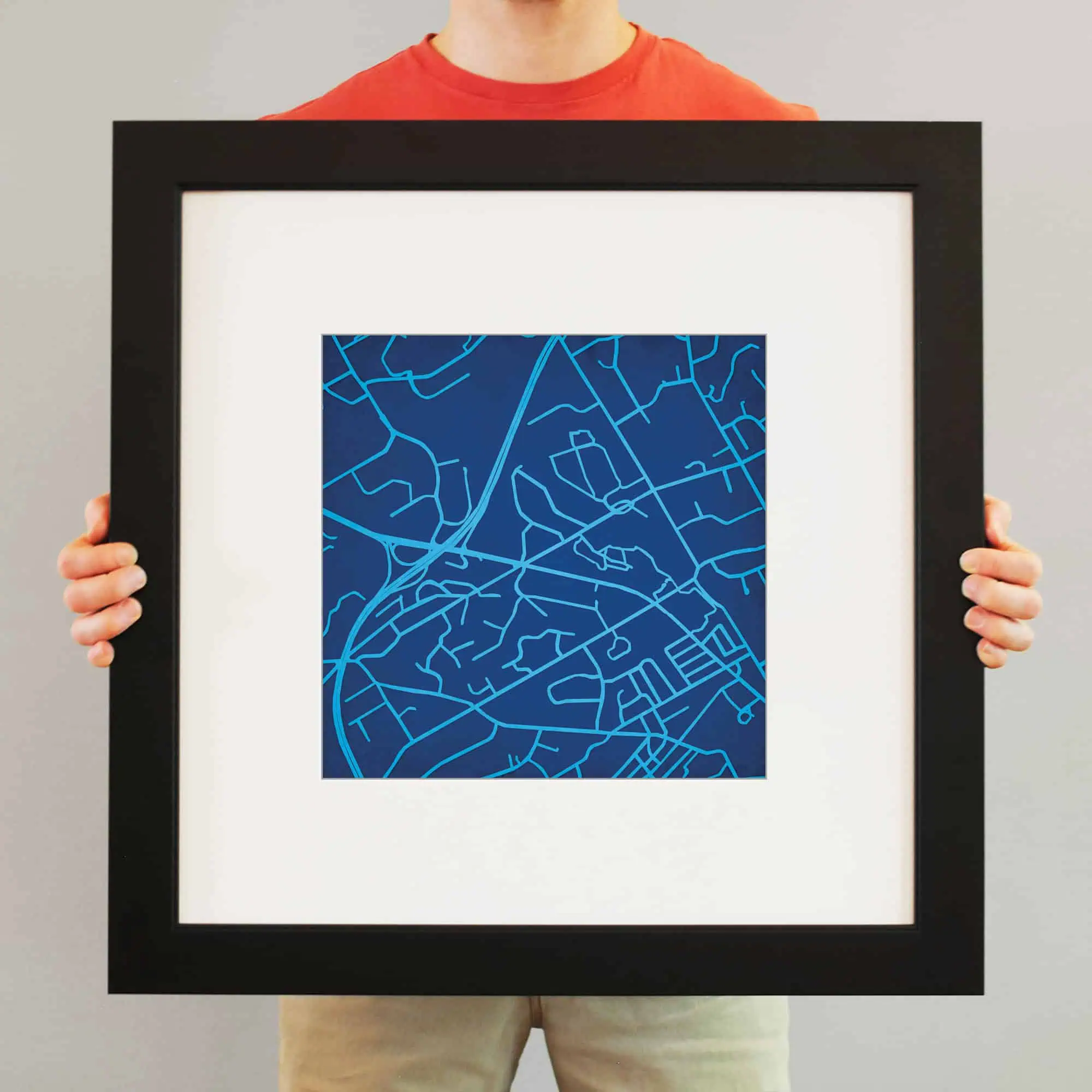 The size of this frame will vary depending on the size of the map you created. Frames are 16.5″ x 16.5″ for 12″ x 12″ prints and frames are 16.5″ x 20.5″ for 12″ x 16″ maps. Our frames have a black 2.75” wide heavy polystyrene molding. We choose to mount the prints without a glass/acrylic overlay, which shows off the unique properties of our paper stock when it hits the light. The back of the frame is sealed with a dust cover for added protection. Industrial silver hanging hardware is fixed to the back of the frame so it’s ready to hang on your wall.