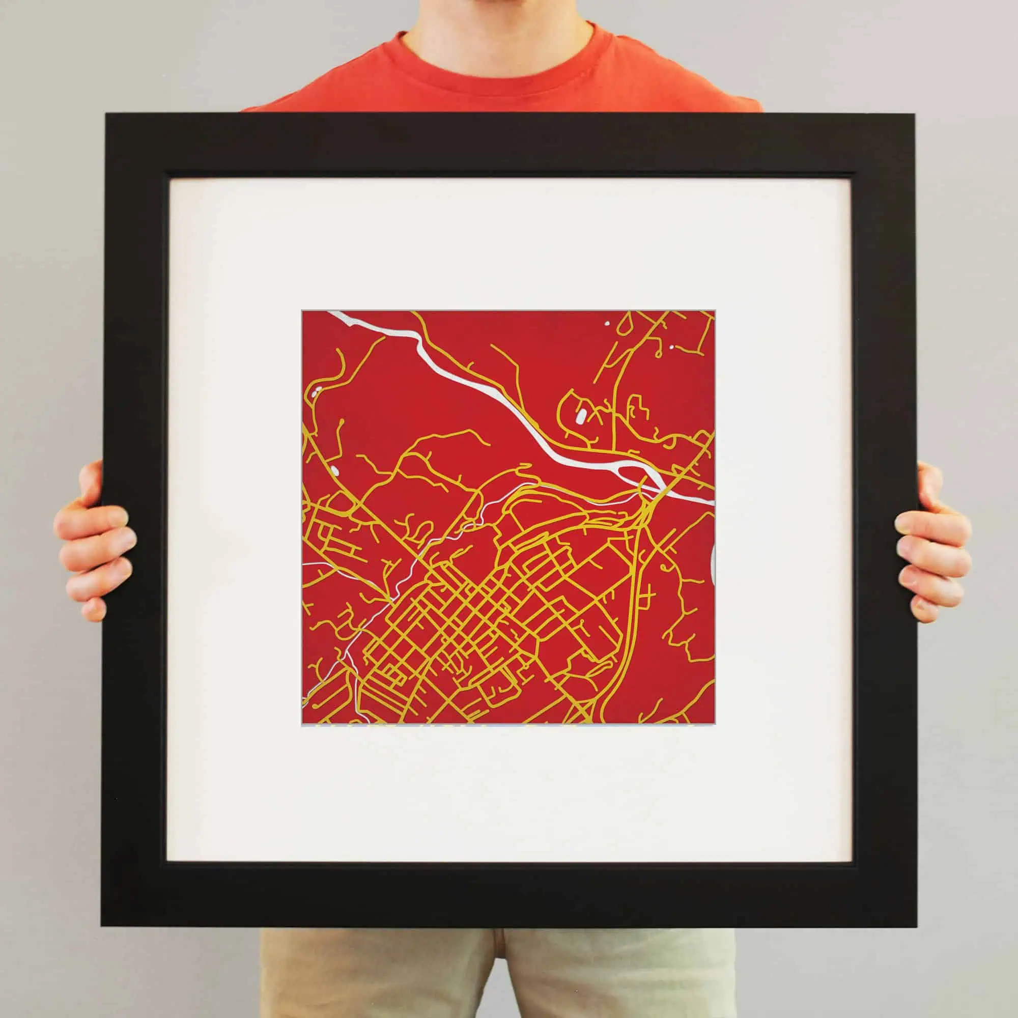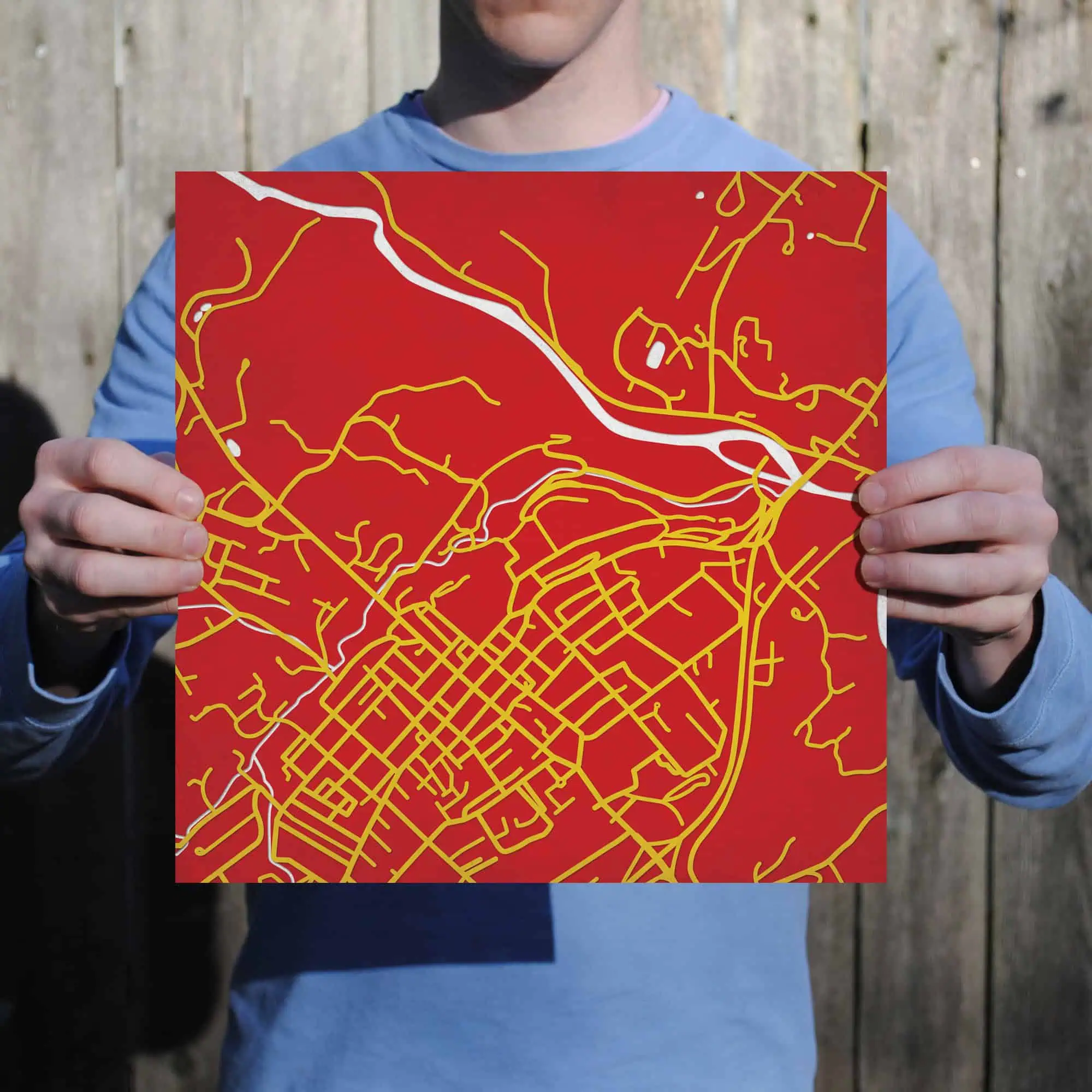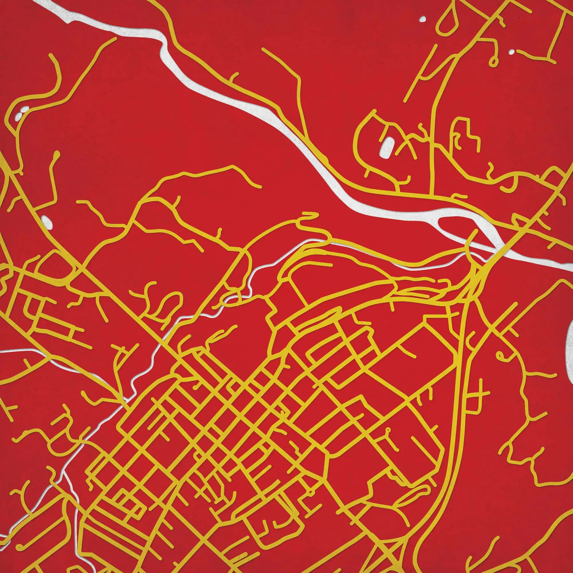 Colorful city map wall art featuring prominent street layouts and urban design, perfect for home or office decor, highlighting city navigation and geographic features.