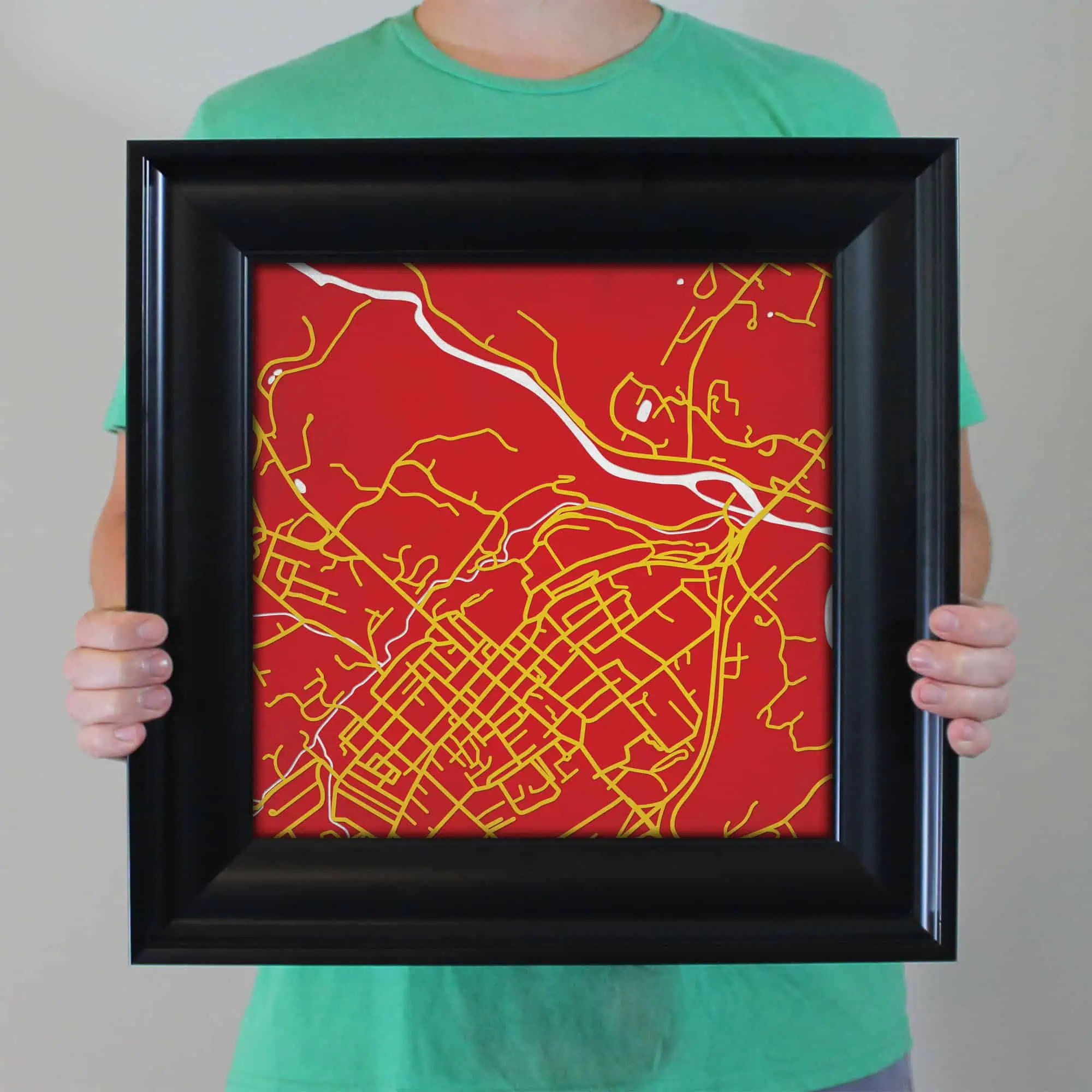 The size of this frame will vary depending on the size of the map you created. Frames are 23″ x 23″ for 12″ x 12″ prints and frames are 15.75″ x 19.75″ for 12″ x 16″ maps. Both frames have a black 1.75” wide genuine-wood molding. The print is enhanced with a soft white acid-free mat, which is bevel cut and placed on top of the print. The print and matt are protected by a premium crystal-clear acrylic overlay. The back of the frame is sealed with a dust cover for added protection. Industrial silver hanging hardware is bolted to the back of the frame so it’s ready to hang on your wall.