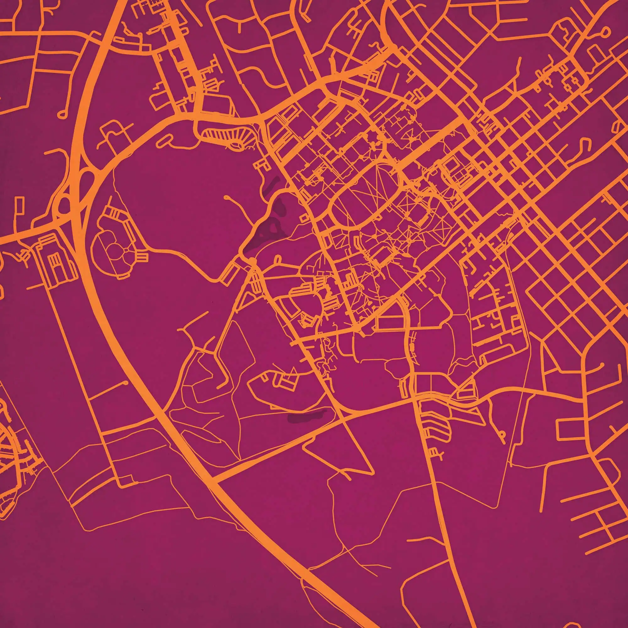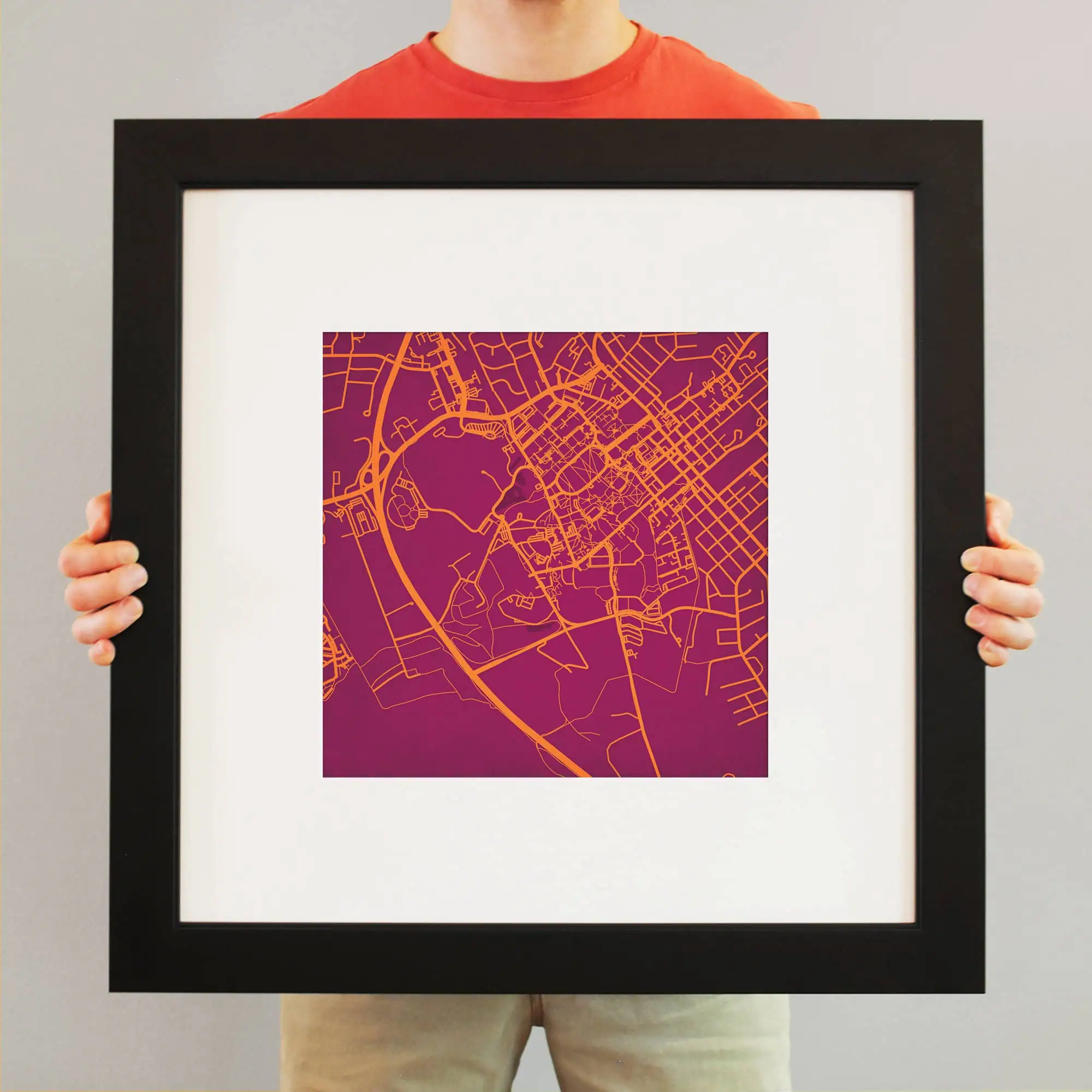 Colorful city map wall art featuring prominent street layouts and urban design, perfect for home or office decor, highlighting city navigation and geographic features.