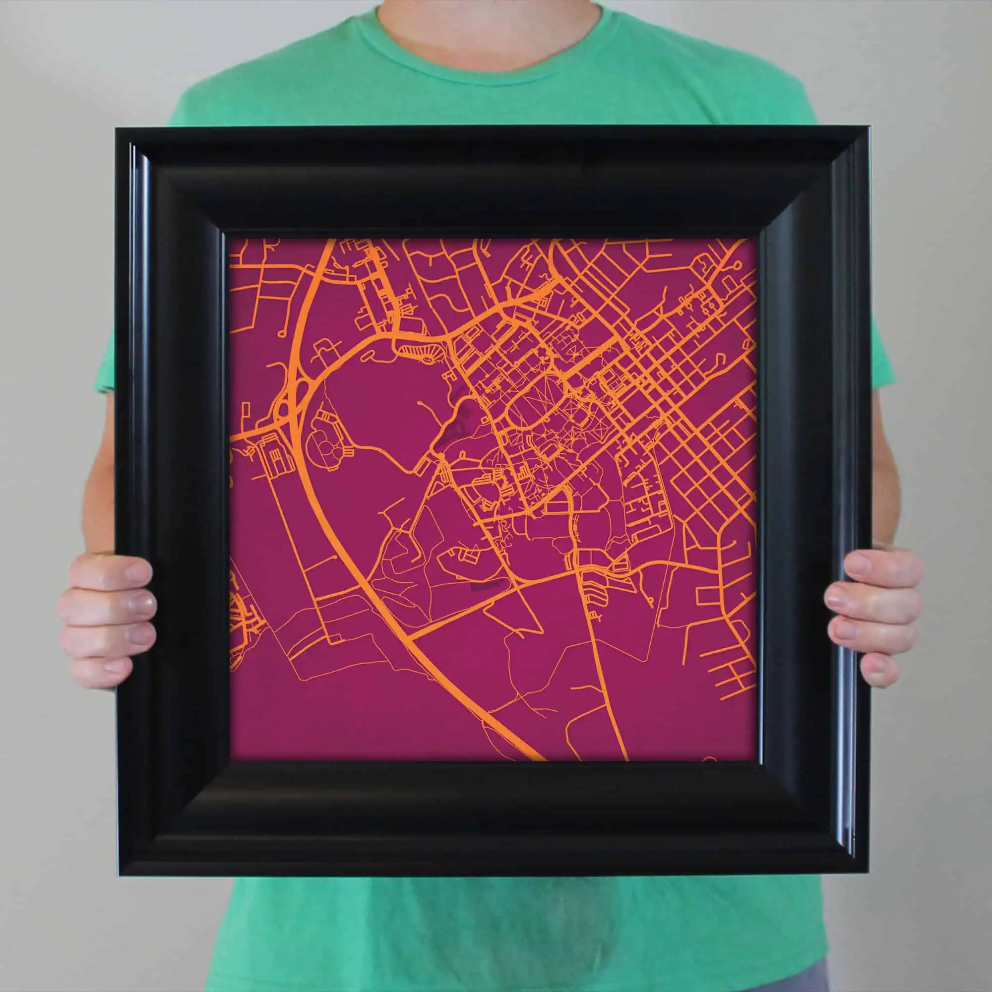 The size of this frame will vary depending on the size of the map you created. Frames are 23″ x 23″ for 12″ x 12″ prints and frames are 15.75″ x 19.75″ for 12″ x 16″ maps. Both frames have a black 1.75” wide genuine-wood molding. The print is enhanced with a soft white acid-free mat, which is bevel cut and placed on top of the print. The print and matt are protected by a premium crystal-clear acrylic overlay. The back of the frame is sealed with a dust cover for added protection. Industrial silver hanging hardware is bolted to the back of the frame so it’s ready to hang on your wall.