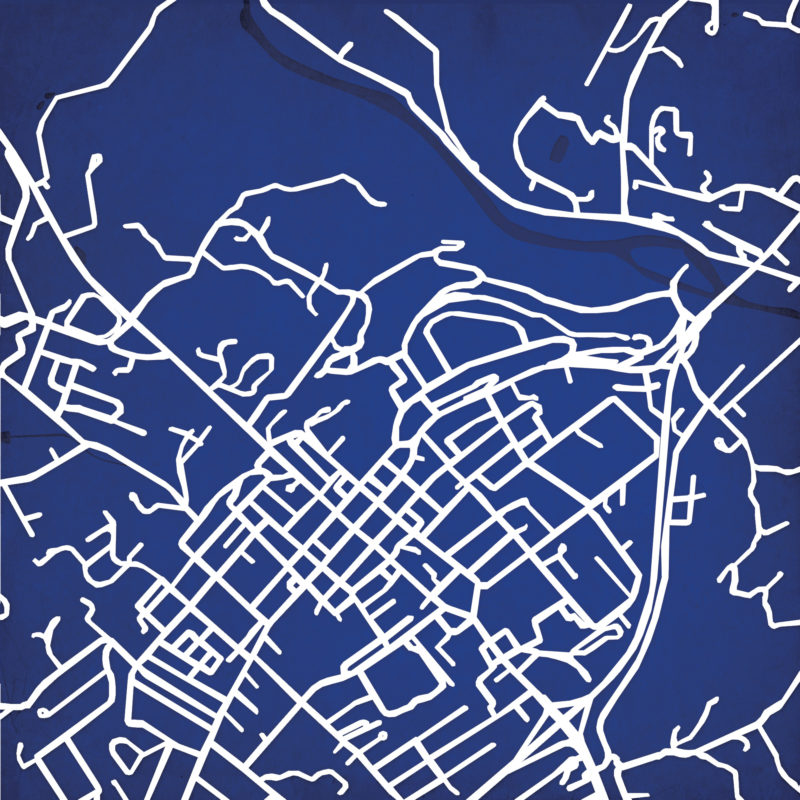 Map art print including Washington and Lee University campus located in Lexington, Virginia.