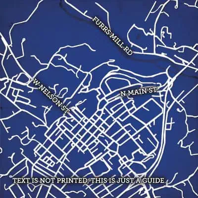 Map art print including Washington and Lee University campus located in Lexington, Virginia.